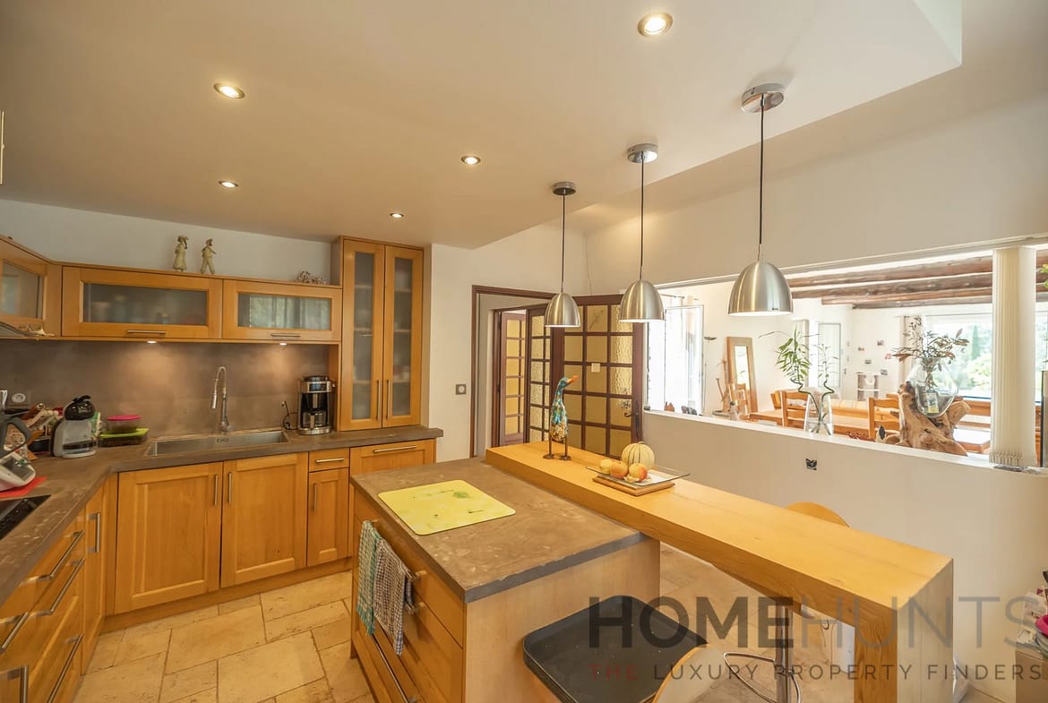 Step outside to a south-facing terrace shaded by majestic trees, where the ambiance is pure Provençal serenity. A heated swimming pool and boules court complete this perfect setting for relaxed family living or hosting guests.