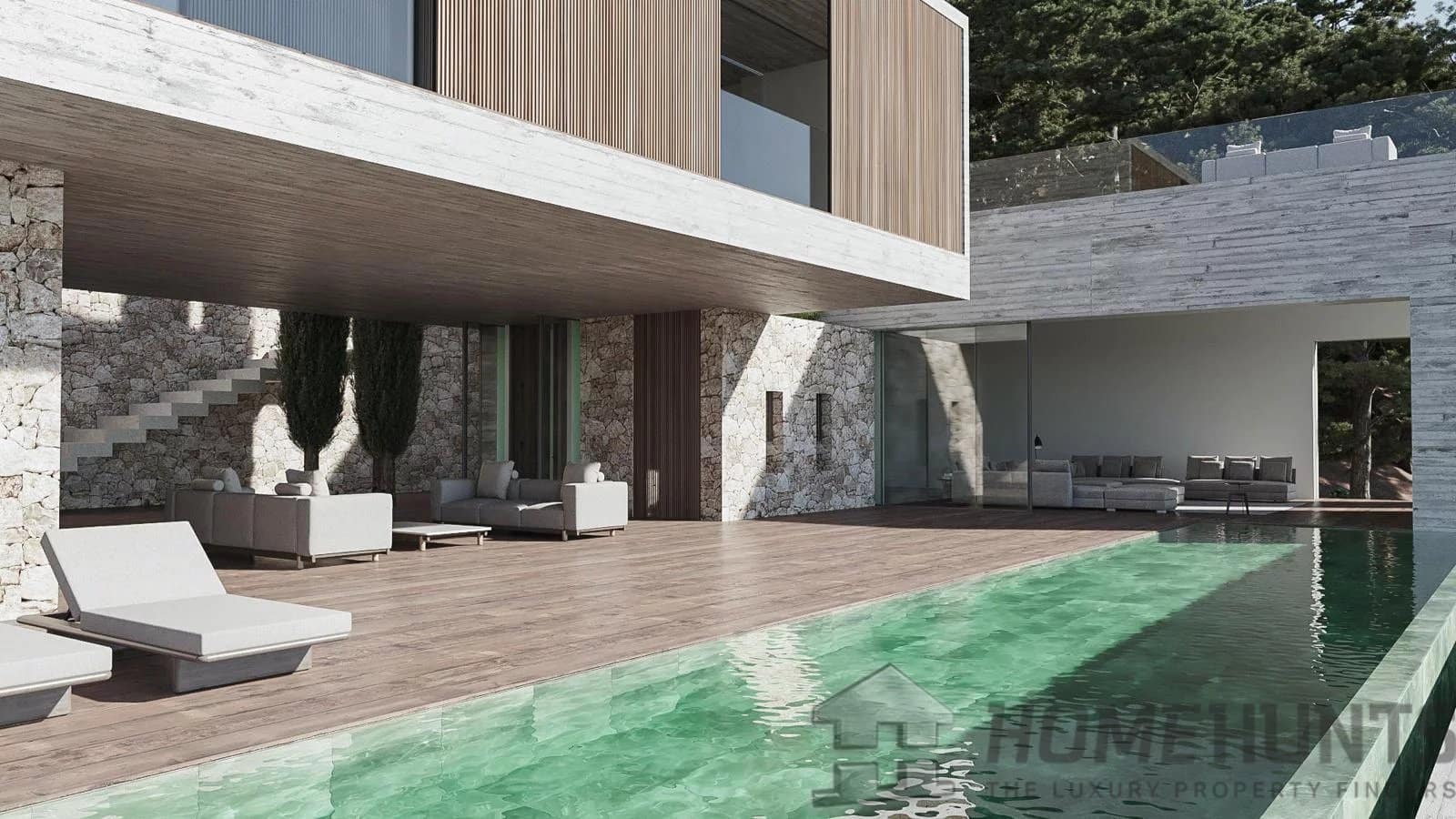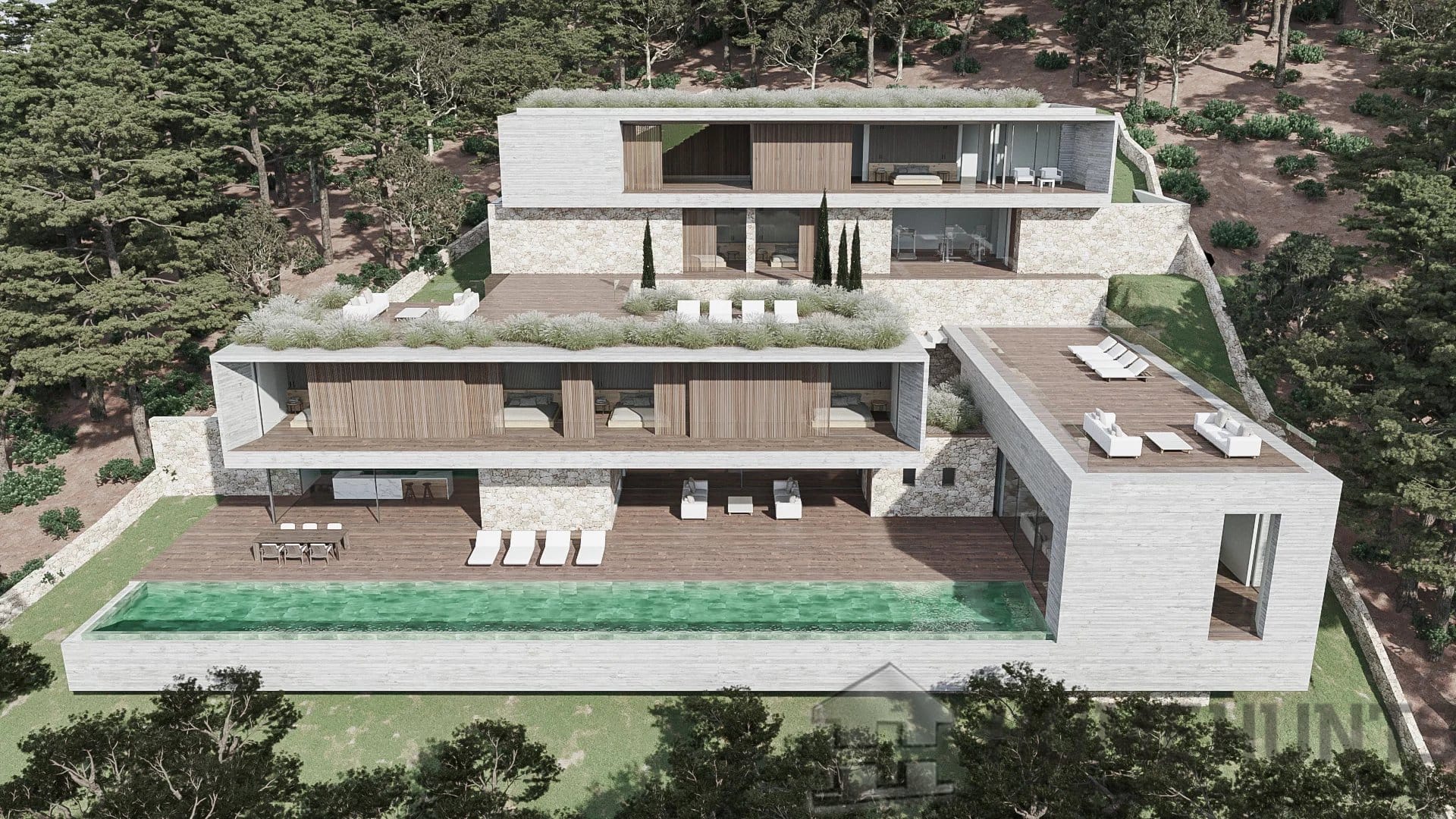 The exterior terrace/porch areas are very large with more than 280 m2. The basement area includes areas for a home cinema, private office, laundry, dressing room, bathroom, garden room, and machinery/storage rooms.