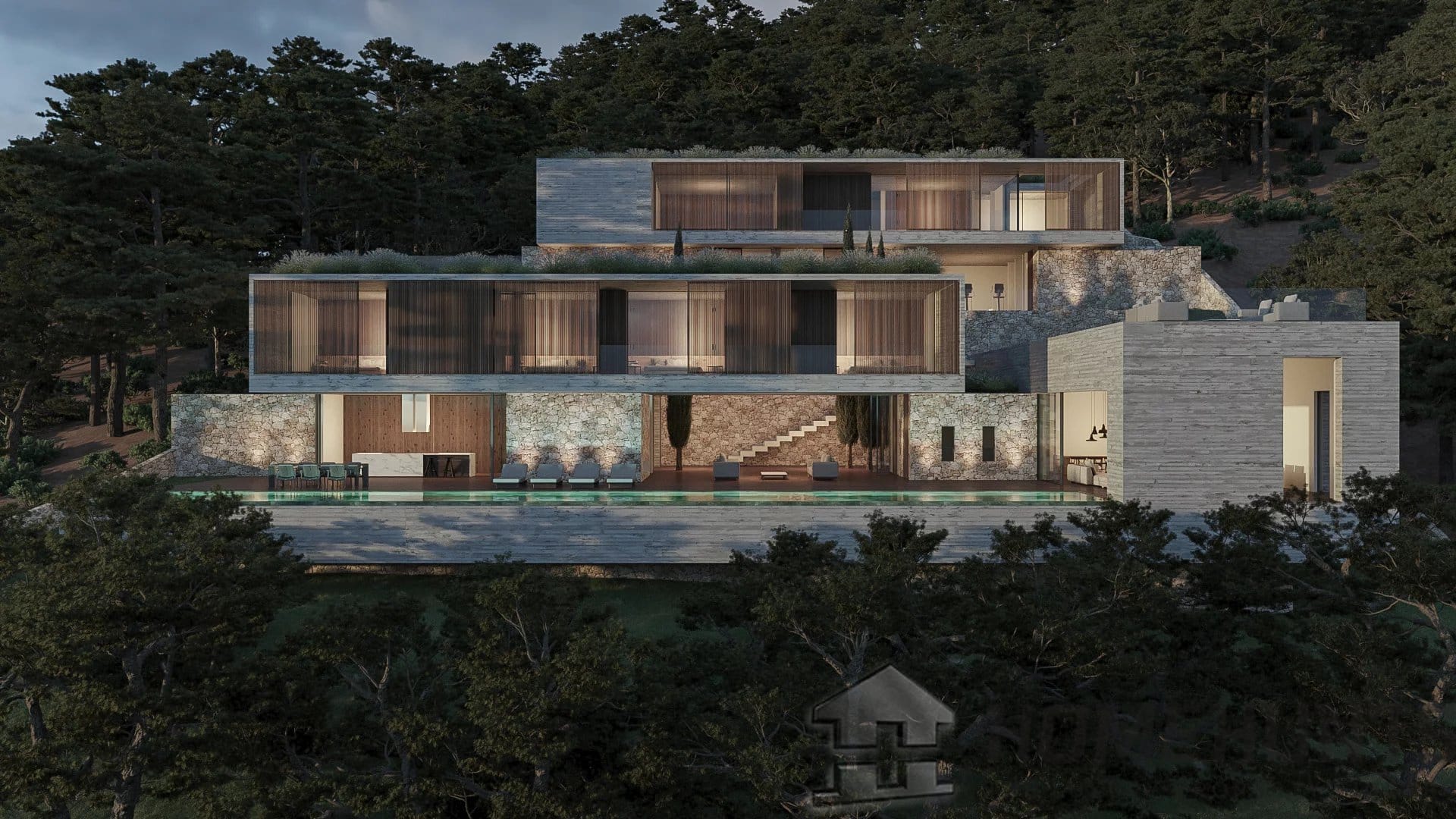 The project envisions a residence built on five floors, all of which are accessible via a lift. The entrance level includes a 4-car garage, a representative entrance with a water feature, and the entire floor is dedicated to the owner’s suite, which is the highest level in the property, offering breathtaking panoramic views. It includes a stunning en suite bathroom, a spacious dressing room, and direct access to a covered porch, ideal for private relaxation.