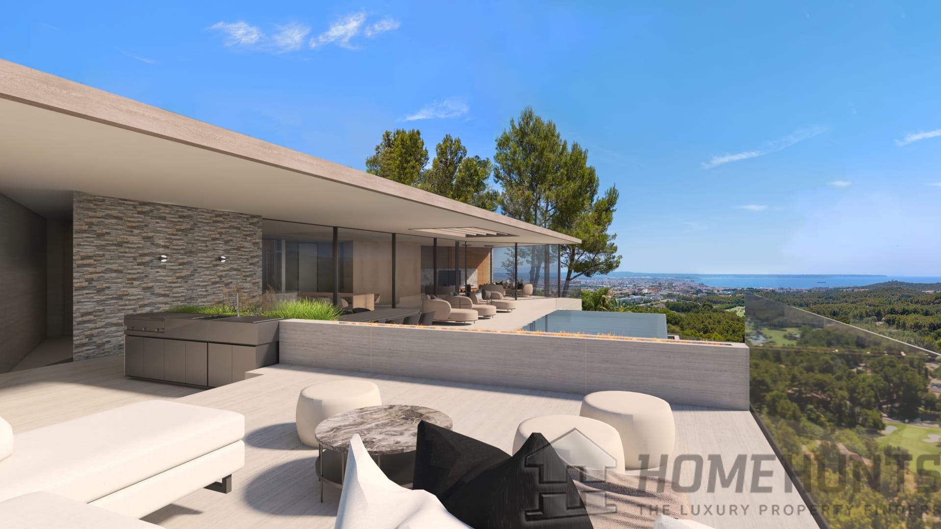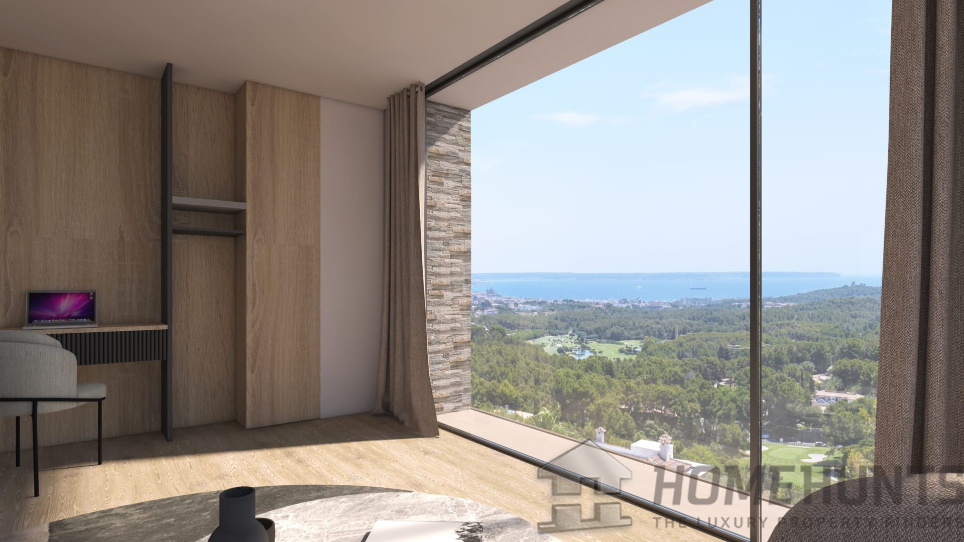 The plot of 2,070 m2 allows for a constructed area of an impressive 1,480 m2 and offers a unique, fully developed location bordering a protected green zone to the east. The unique orientation of the three-storey house allows you to enjoy unrestricted views over the three renowned golf courses of Son Vida and the vibrant cityscape of Palma from every floor.