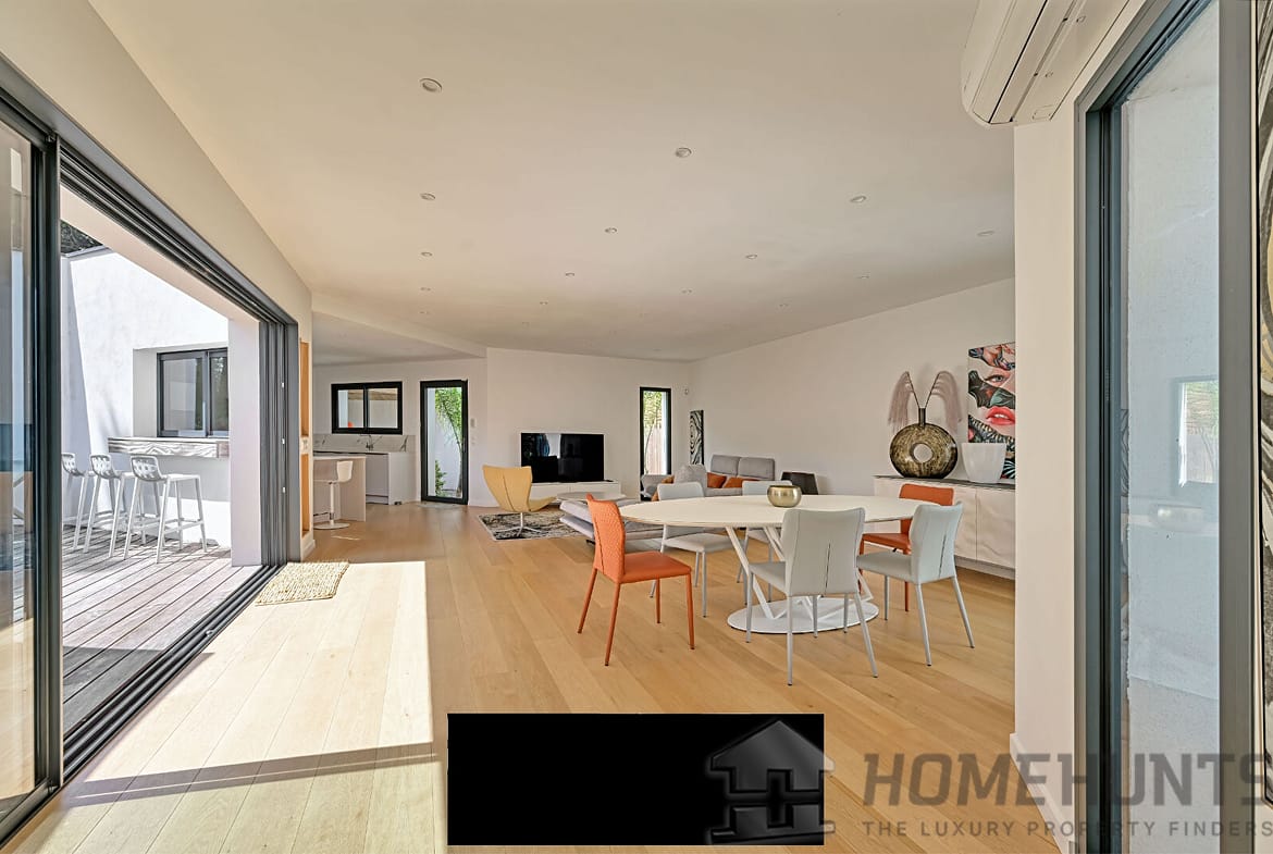 The resolutely warm atmosphere of this villa, the recent quality fittings and the very marked “inside/outside” organization of the places in osmosis with nature, offer a truly exceptional living environment just a stone’s throw from the old fortified town and the beautiful wild beaches of Occitanie.