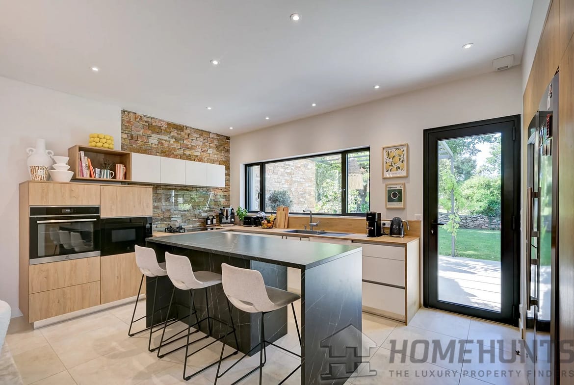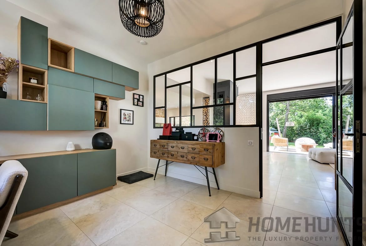The fully equipped open-plan kitchen is harmoniously integrated and includes a convenient home office space — ideal for remote working. On the ground floor, an elegant master suite offers a private bathroom and a large walk-in dressing room.