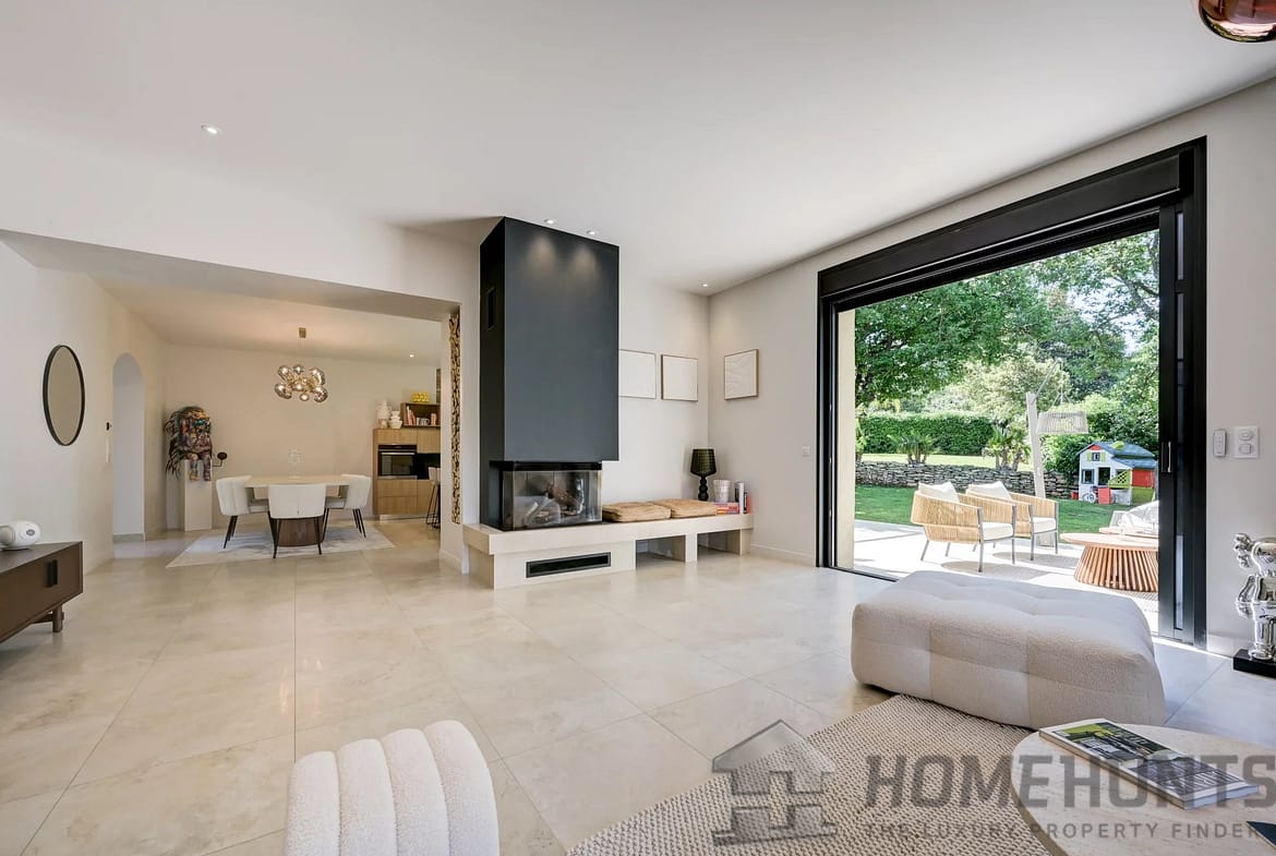 With a living area of approximately 230 m2, the villa opens onto a spacious entrance hall leading to a utility room, separate WC, and a bright double living room featuring large sliding pocket doors, a wood-burning insert, and impressive ceiling height. This beautiful living space flows seamlessly into the garden, offering a perfect indoor-outdoor lifestyle.