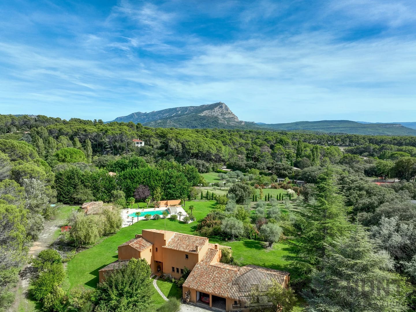 Just 10 minutes from Aix-en-Provence, in the sought-after area of Saint-Marc-Jaumegarde, lies this rare one-hectare gated estate offering absolute tranquility and breathtaking views of the iconic Mont Sainte-Victoire.