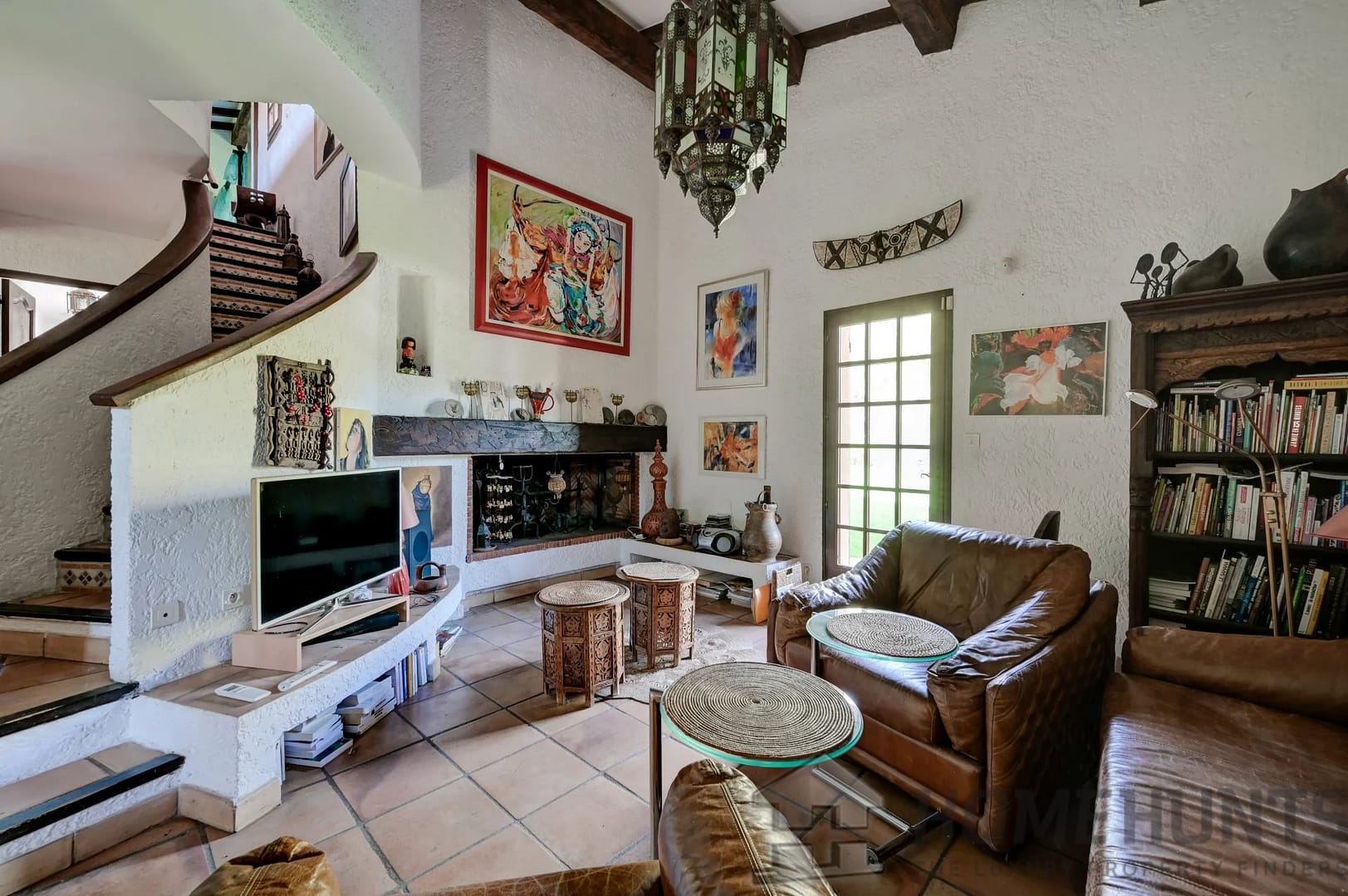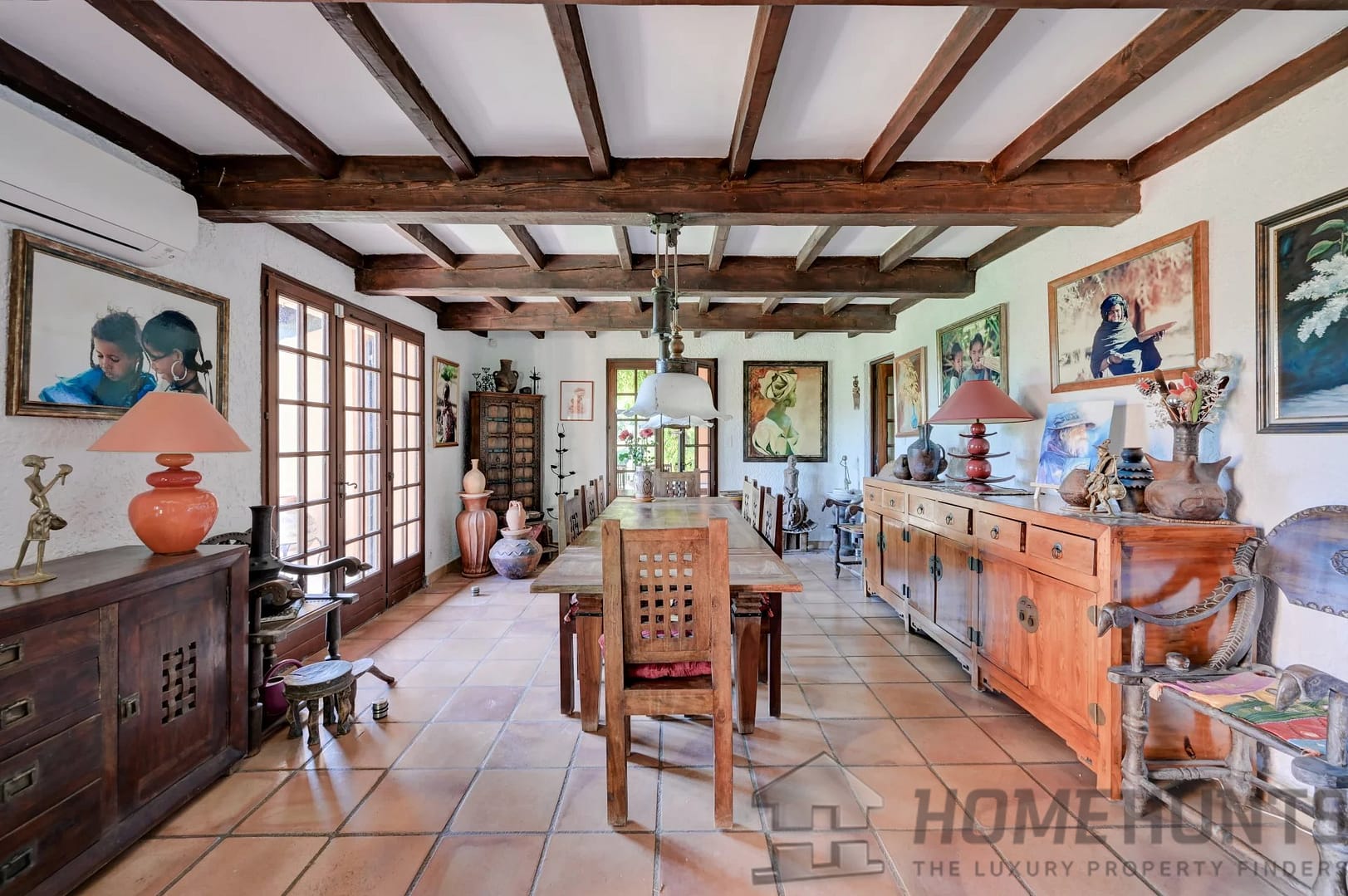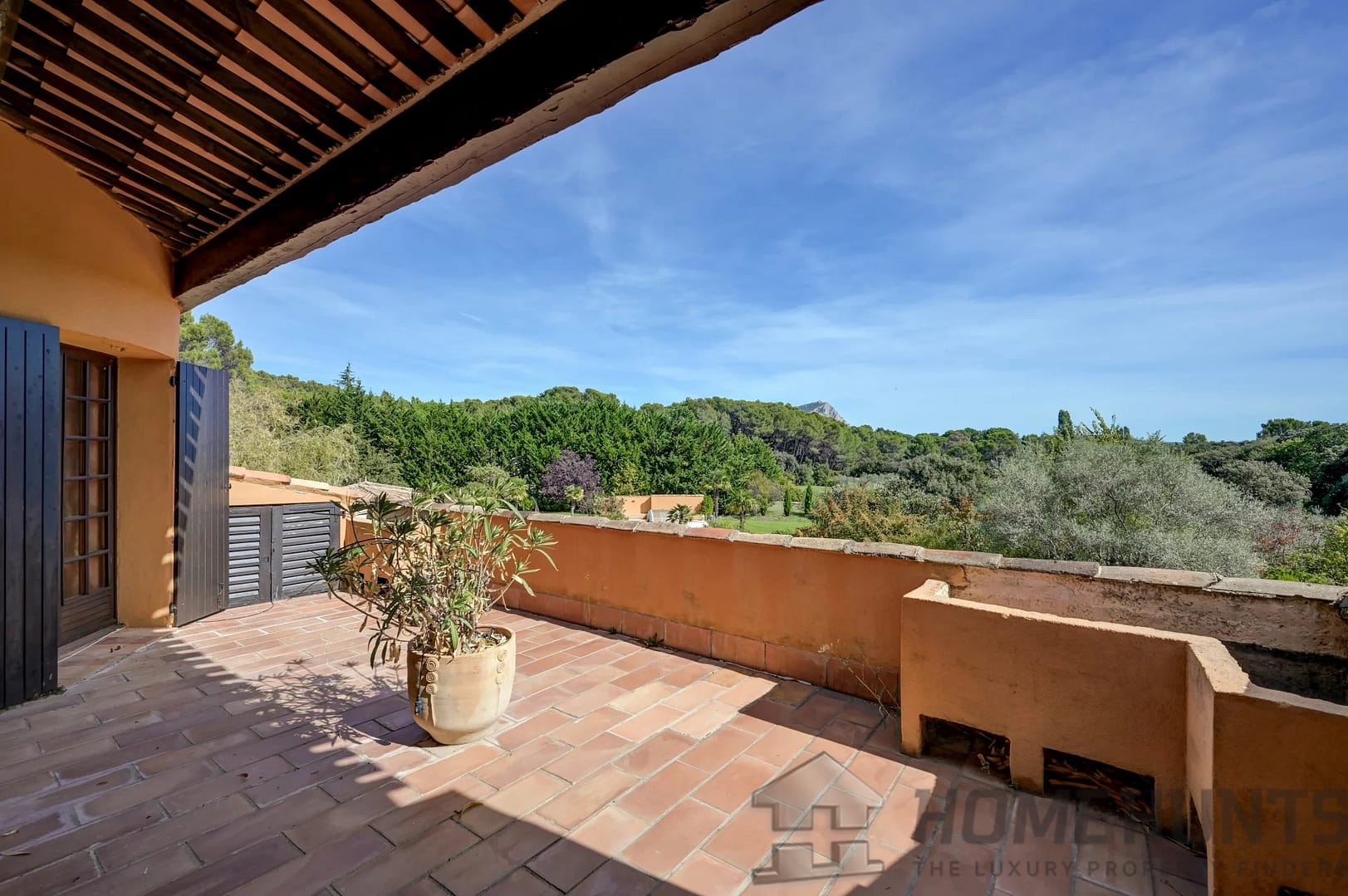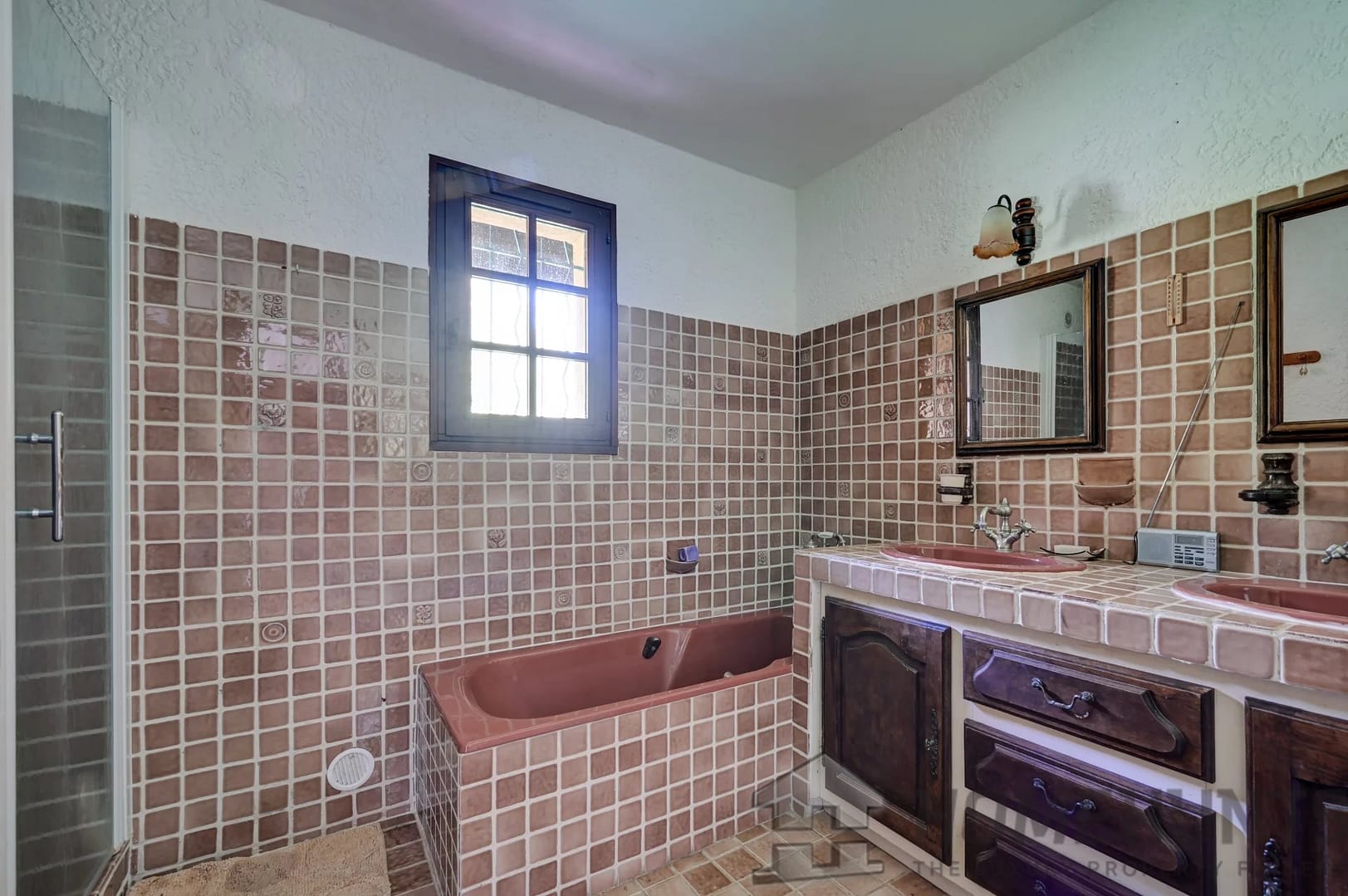 The main house spans approximately 250 m2 and combines Provencal charm with generous spaces: bright double living room, cosy fireplace lounge with covered terrace, fully equipped kitchen, two ground-floor bedrooms with bathroom, plus two upstairs bedrooms with bathroom, office, and panoramic terrace.