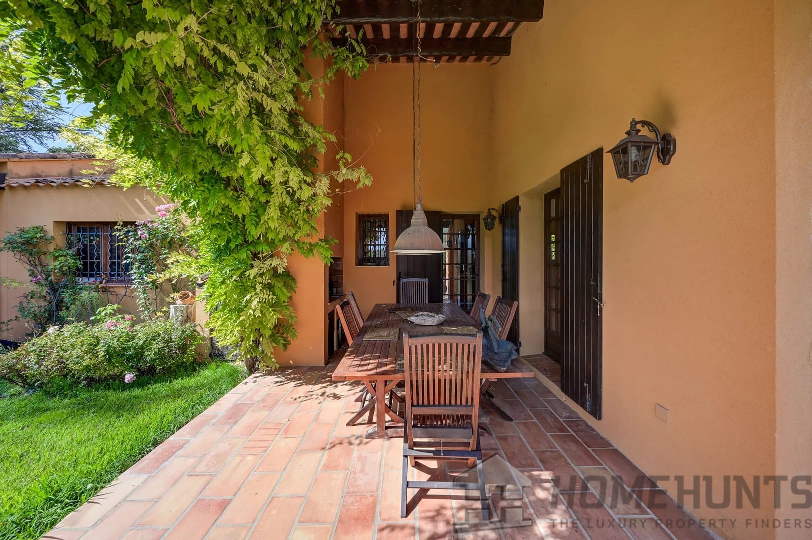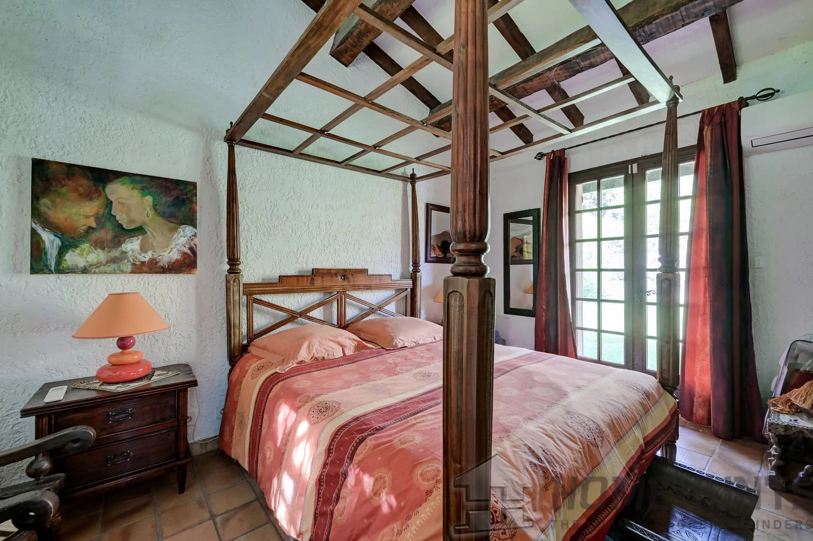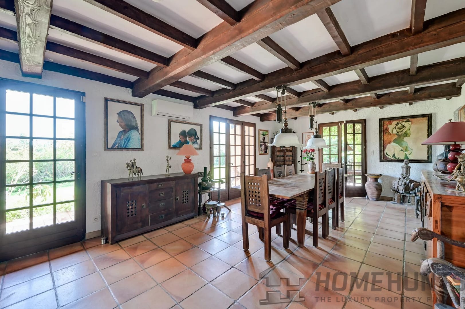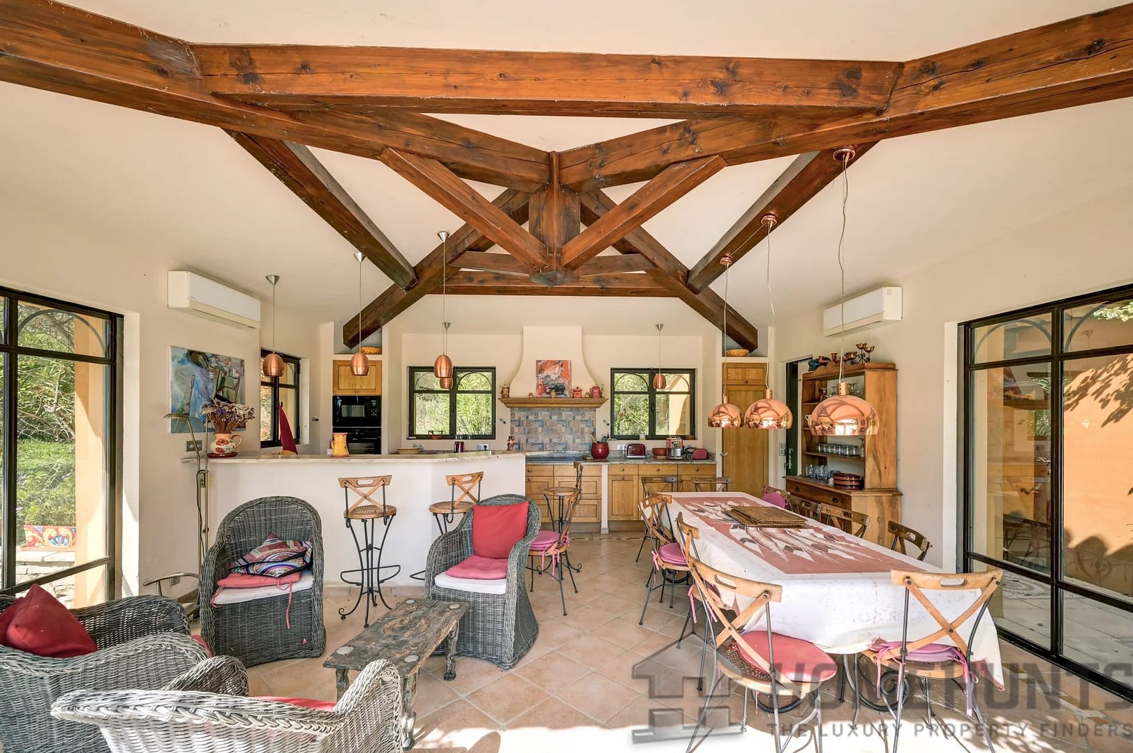 The main house spans approximately 250 m2 and combines Provencal charm with generous spaces: bright double living room, cosy fireplace lounge with covered terrace, fully equipped kitchen, two ground-floor bedrooms with bathroom, plus two upstairs bedrooms with bathroom, office, and panoramic terrace.