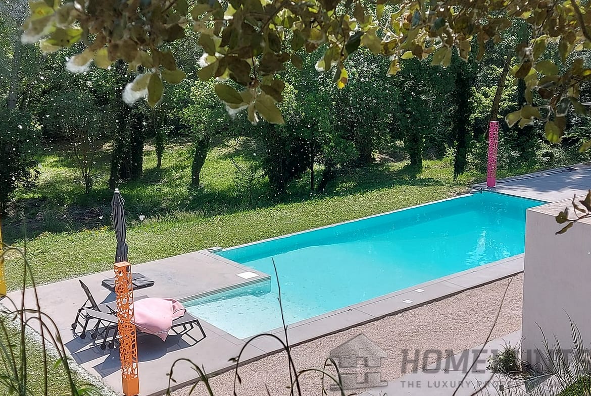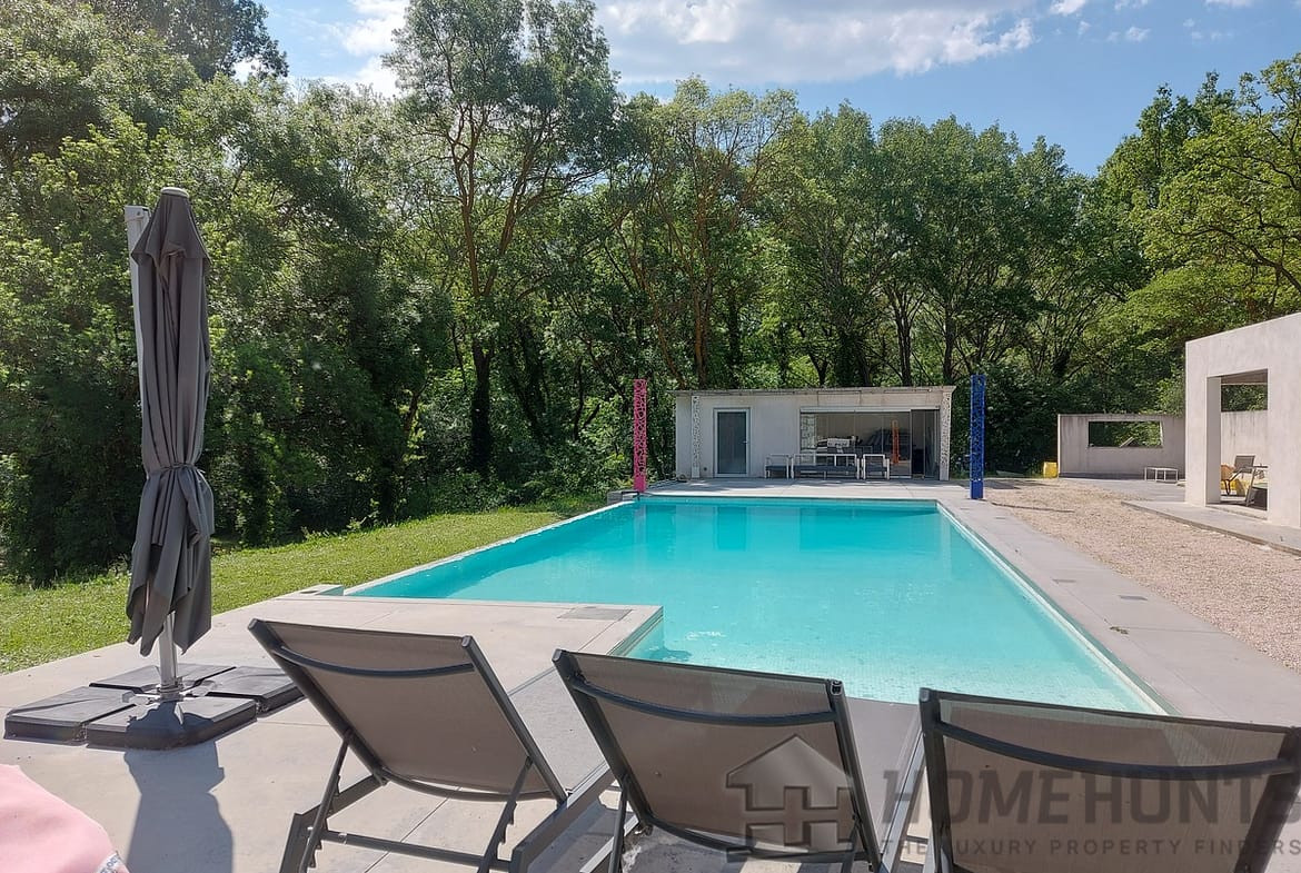 The landscaped grounds feature an infinity pool (14 x 6 m) and a summer kitchen. The pool house is ready to be converted into a relaxation area or whatever else takes your fancy. This little corner of paradise close to the city is bordered by a pretty stream that will delight nature lovers.