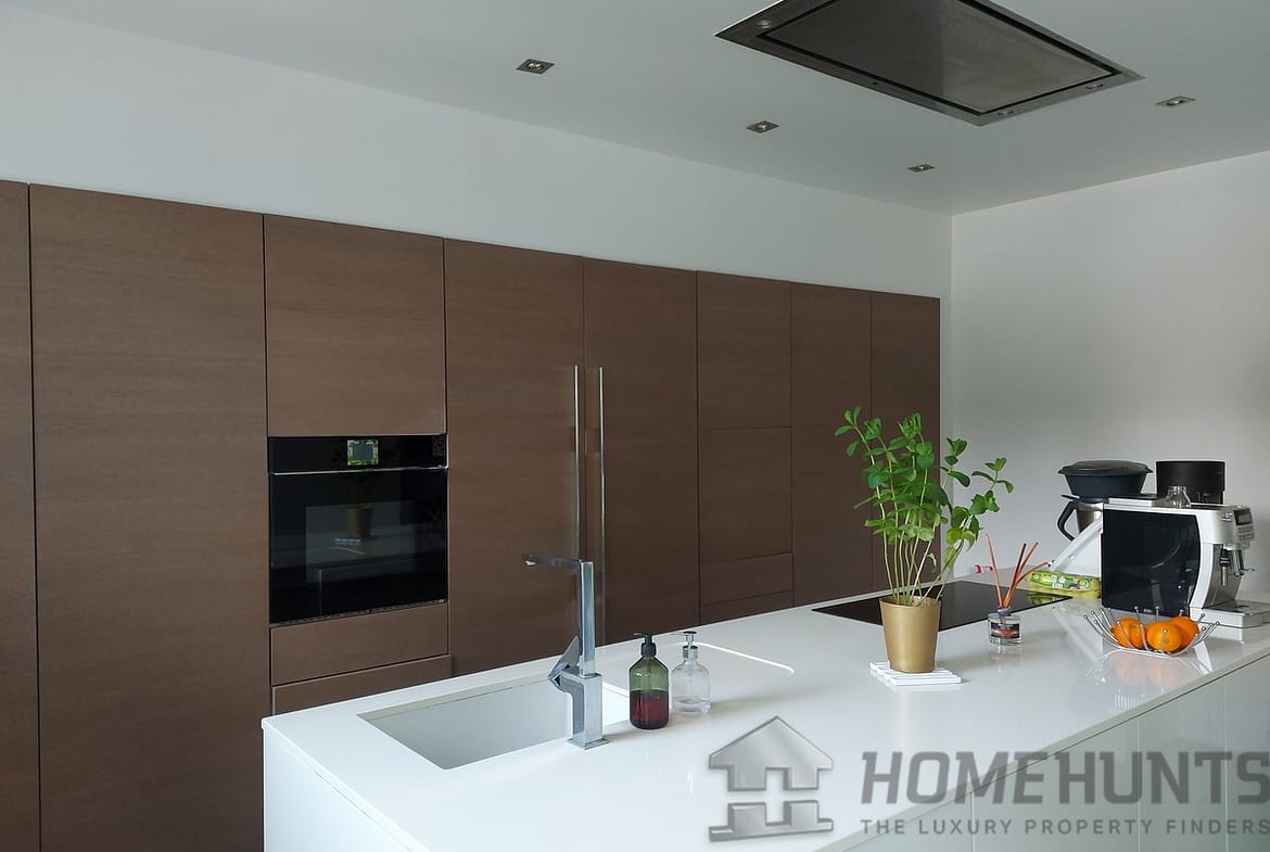 In the basement, there is an office, a small gym with sauna, a wine cellar, a laundry room and storage space.