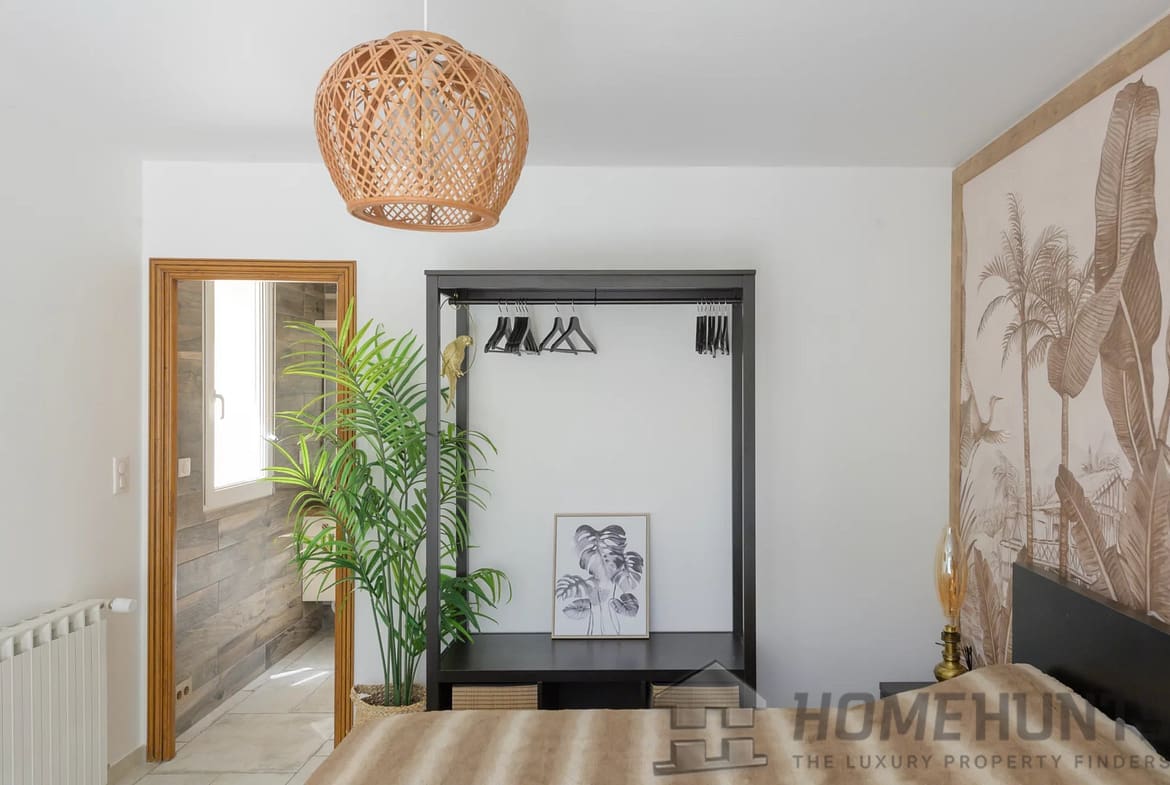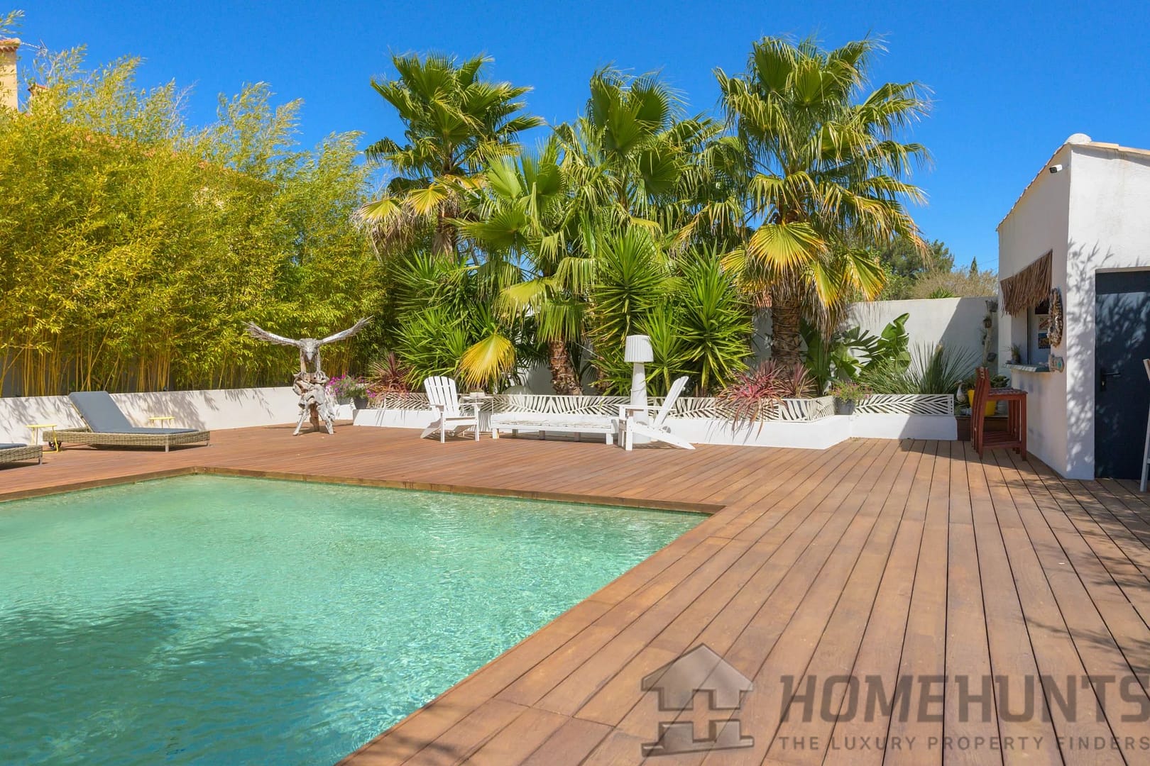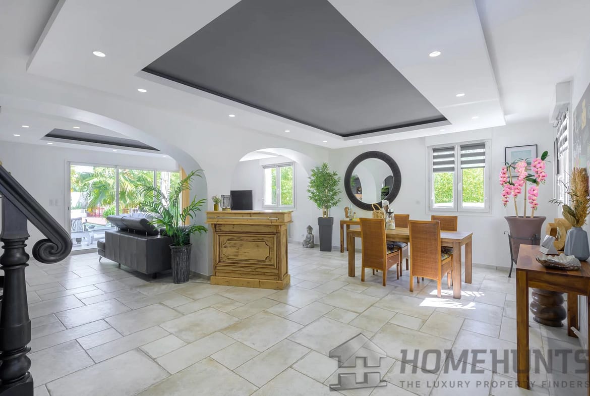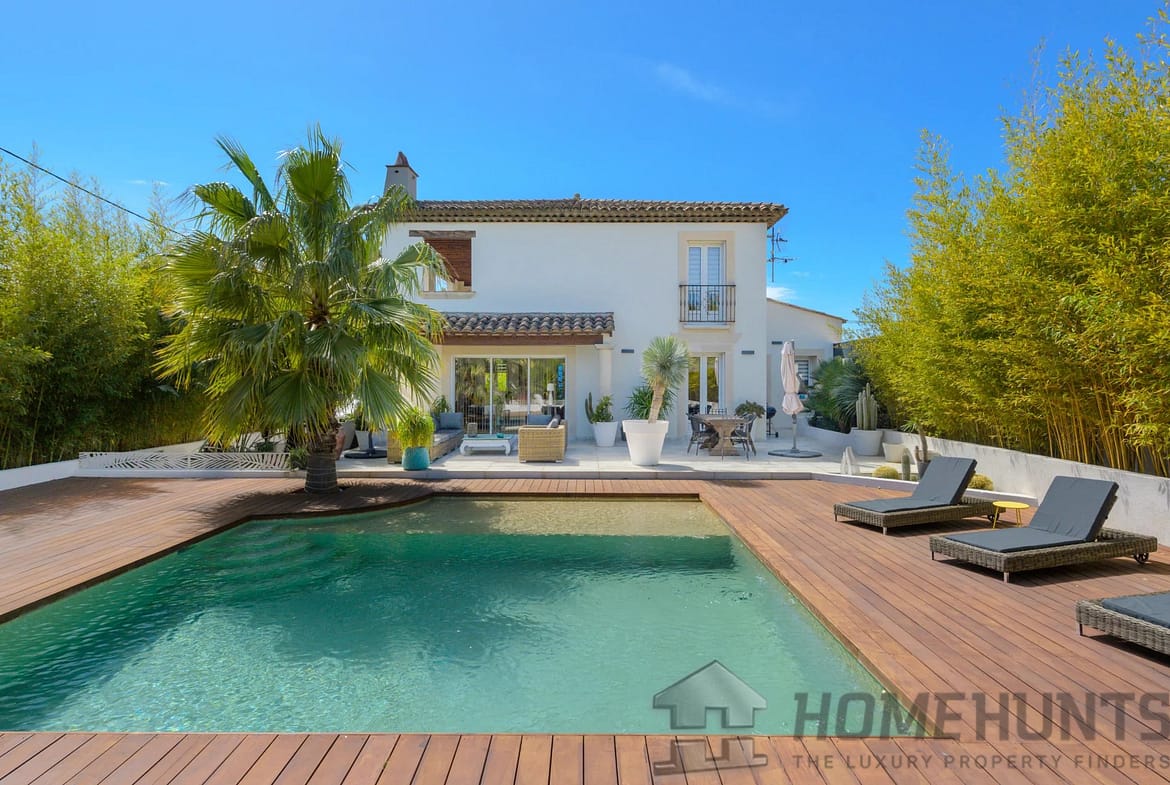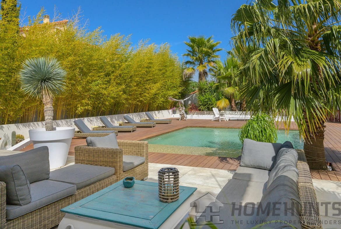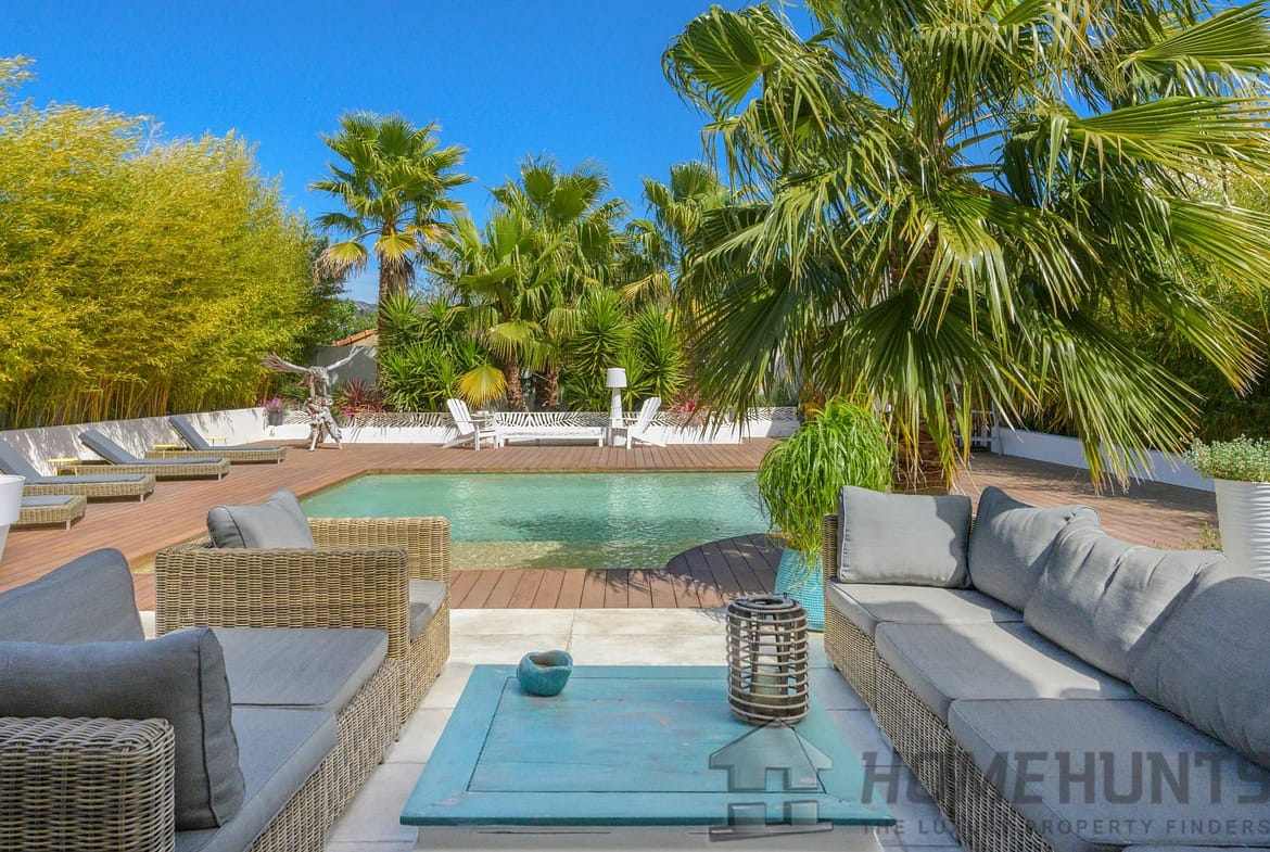 The exterior is laid out as a large wooden terrace bordering the swimming pool and pool house. Exotic trees surround the house, giving it a very pleasant atmosphere. An enclosed garage and several parking spaces complete this property.