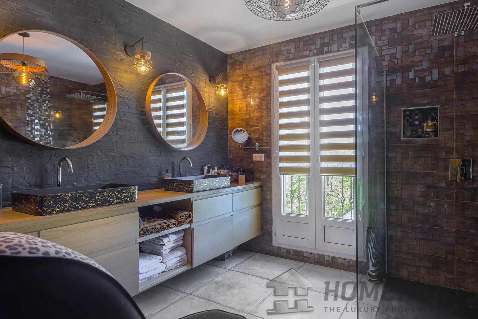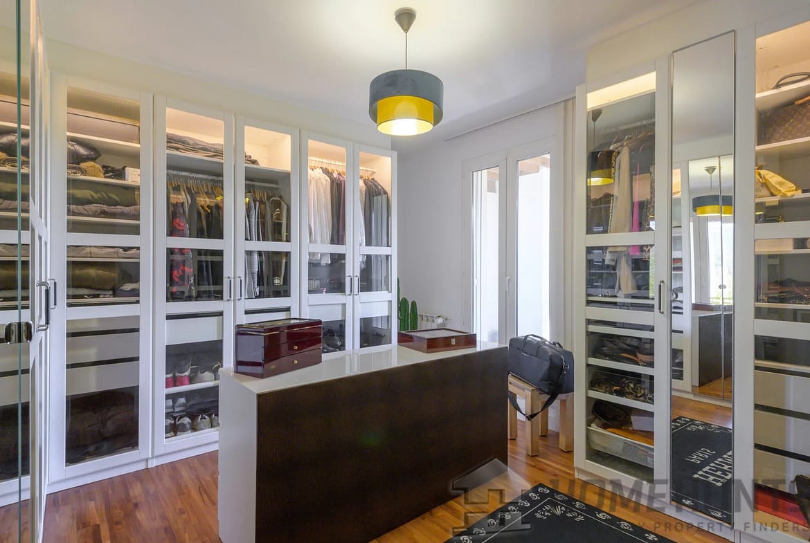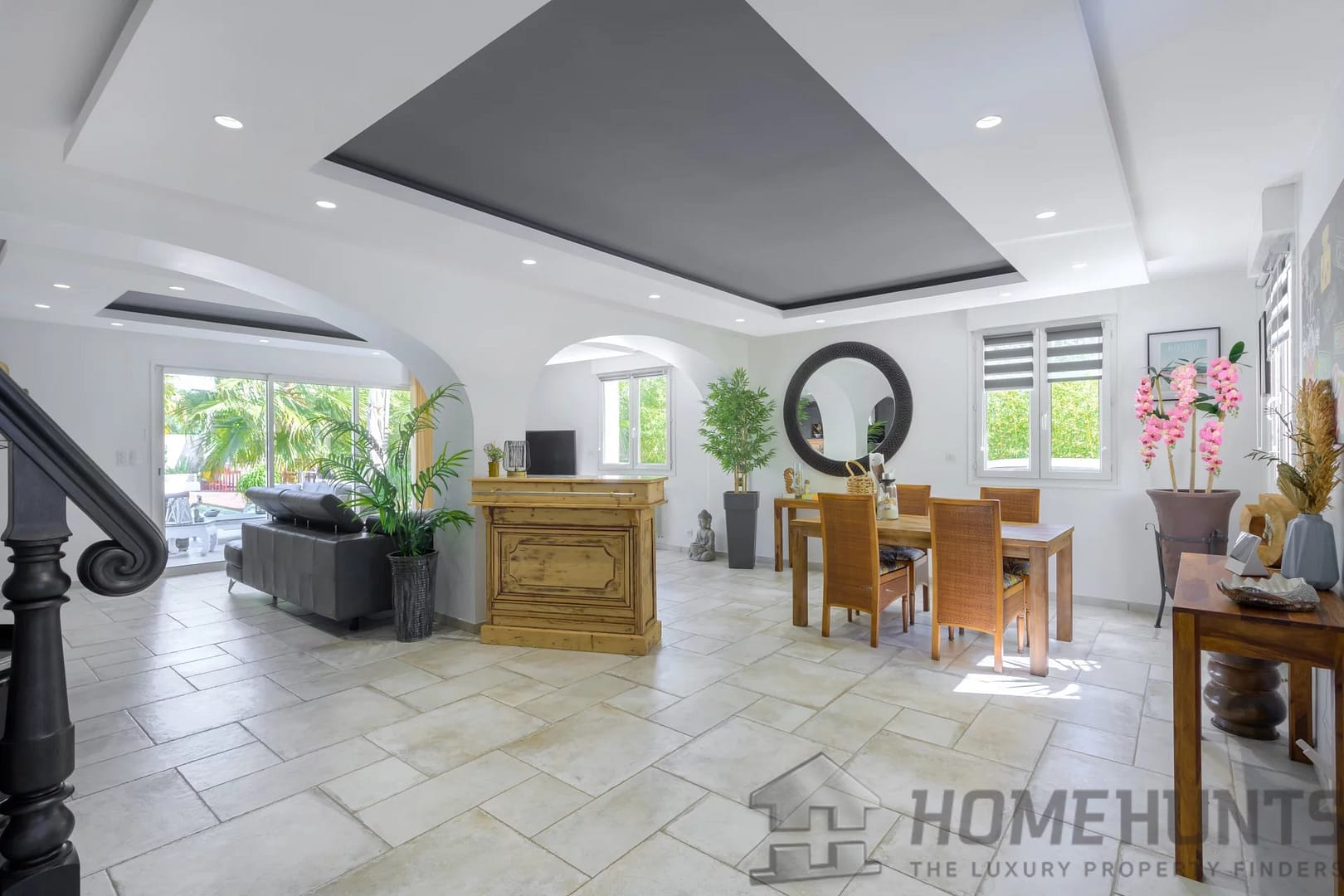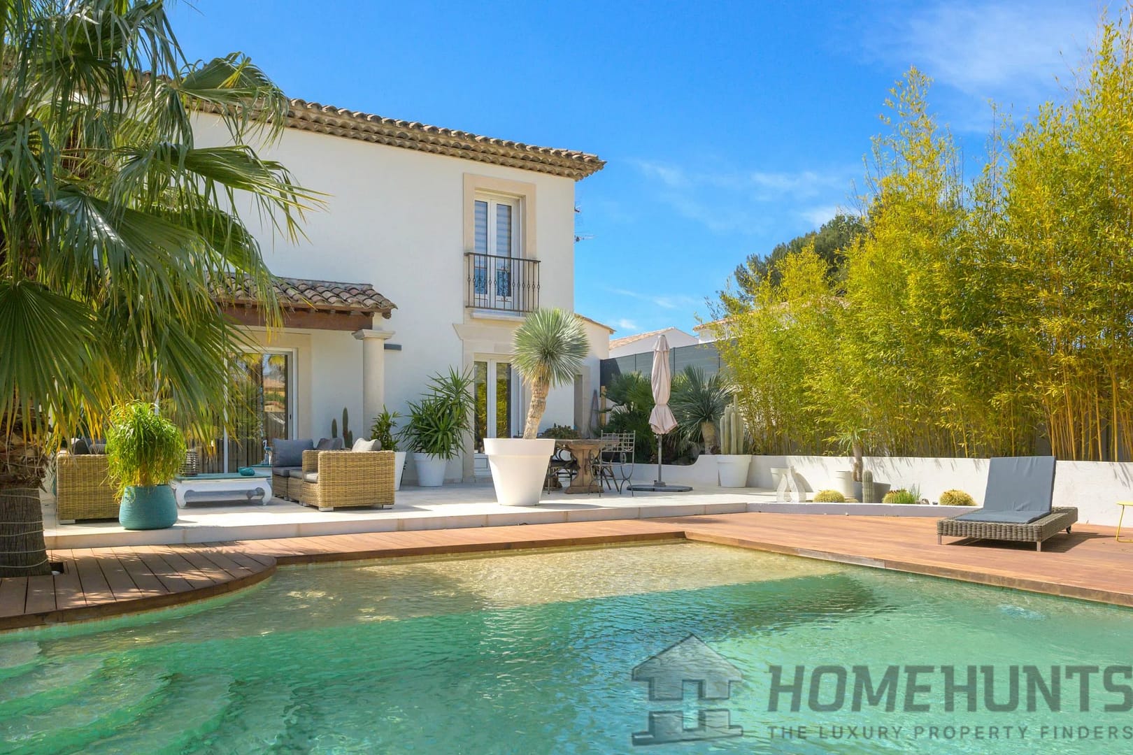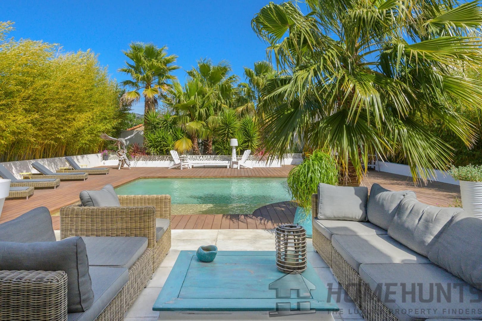 The exterior is laid out as a large wooden terrace bordering the swimming pool and pool house. Exotic trees surround the house, giving it a very pleasant atmosphere. An enclosed garage and several parking spaces complete this property.