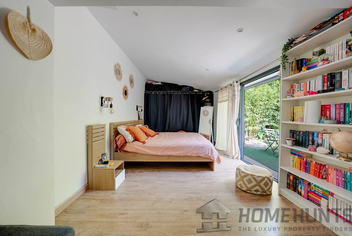 The sleeping area consists of two bedrooms on the main floor, sharing an elegant bathroom, as well as two additional bedrooms on the garden level, including a master suite with dressing room, bathroom, shower and toilet, opening directly onto the garden.