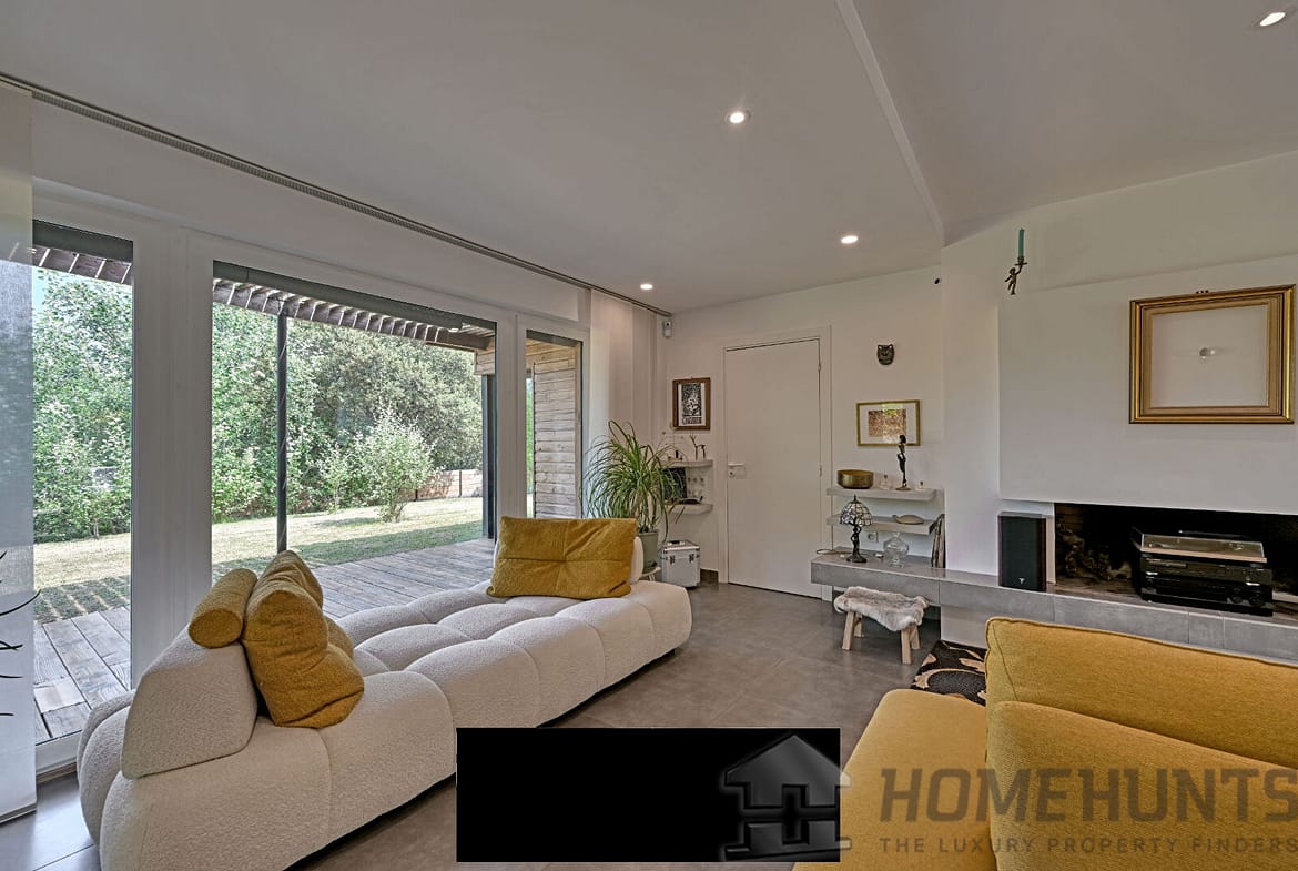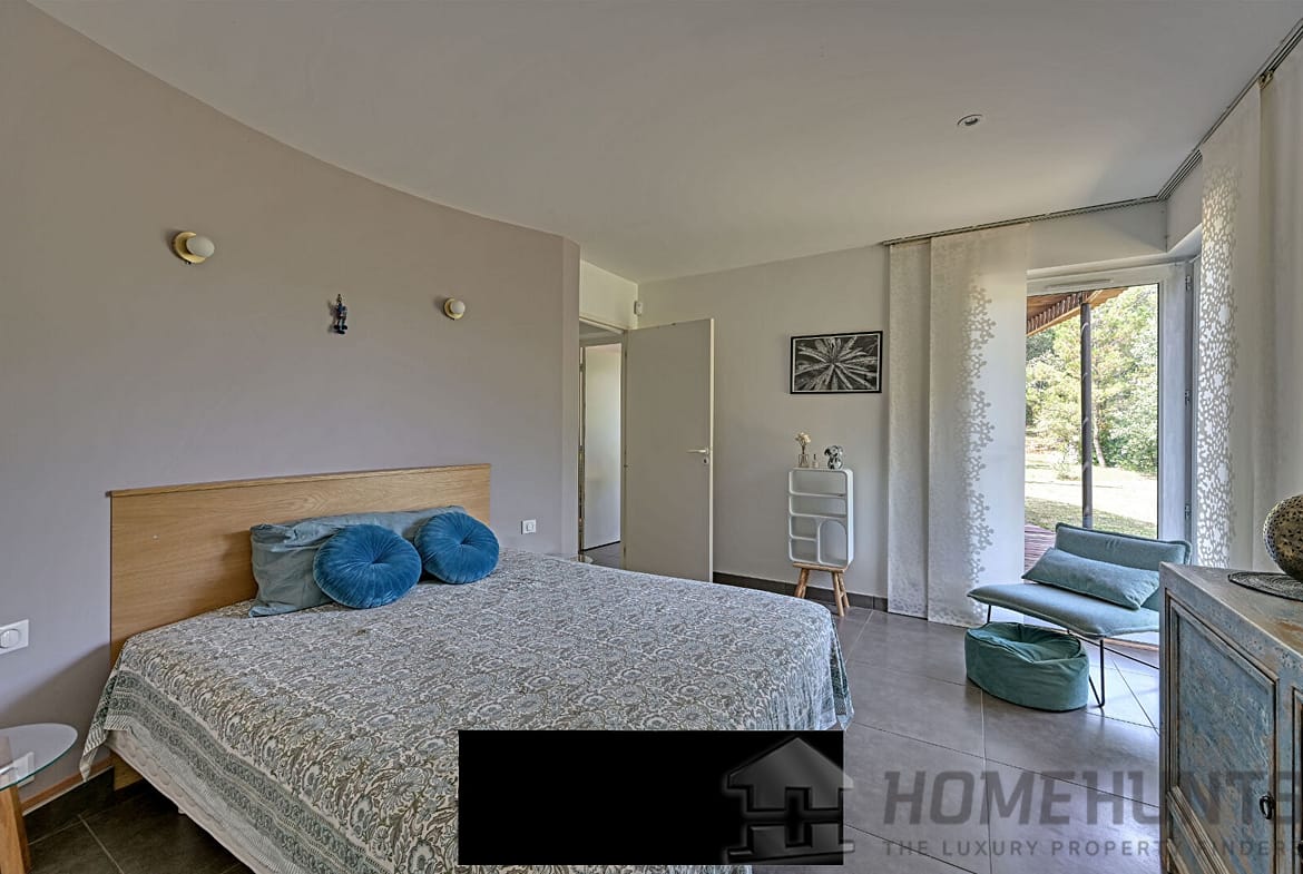 Designed by an architect, with the aim of opening up perspectives and offering maximum views of the beautiful exteriors, the house offers a bright living space equipped with a fireplace and adjoining the refined and functional kitchen. These spaces are largely lit by the bay windows opening onto the terraces, one of which is equipped with a pergola allowing you to enjoy meals sheltered from the sun.