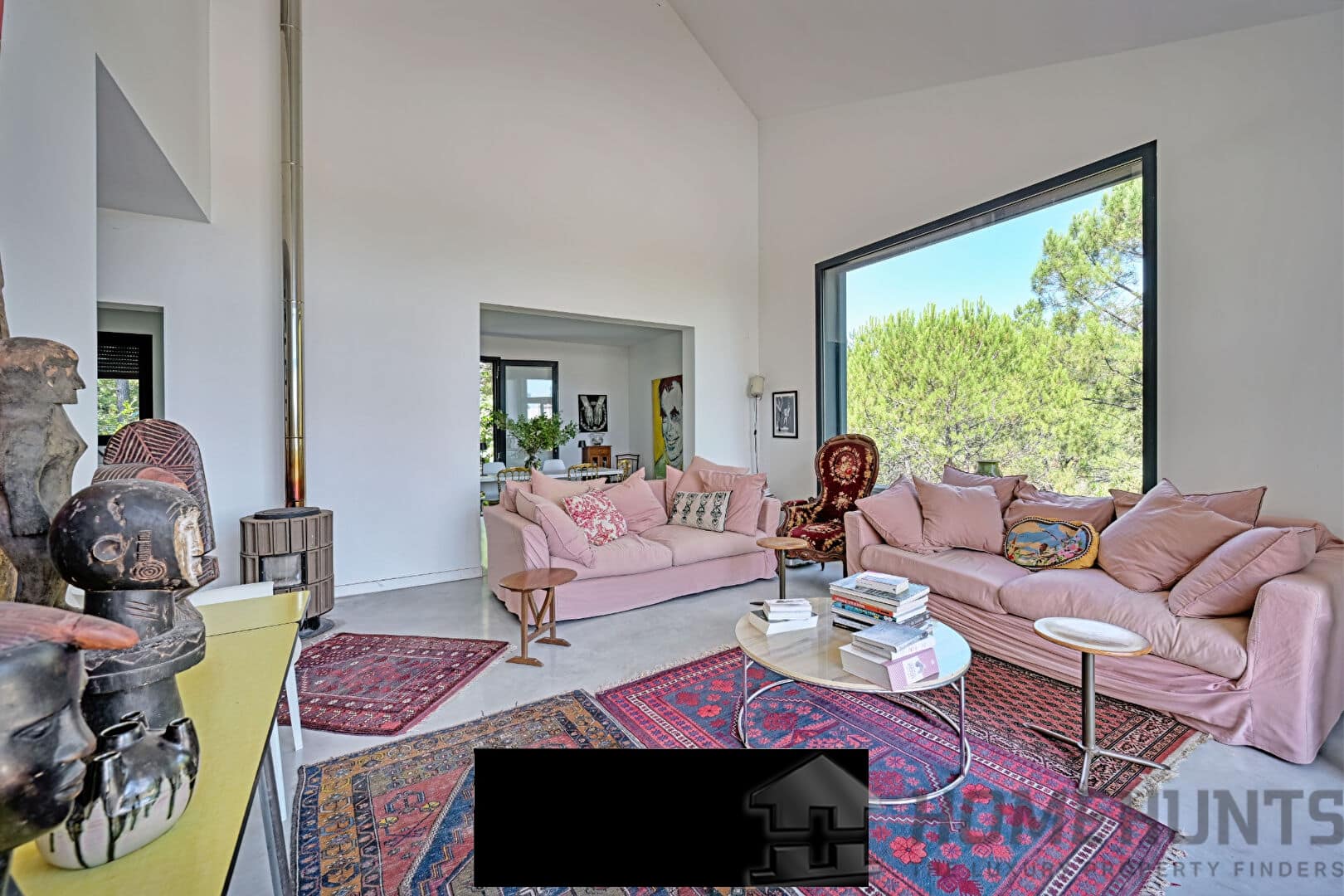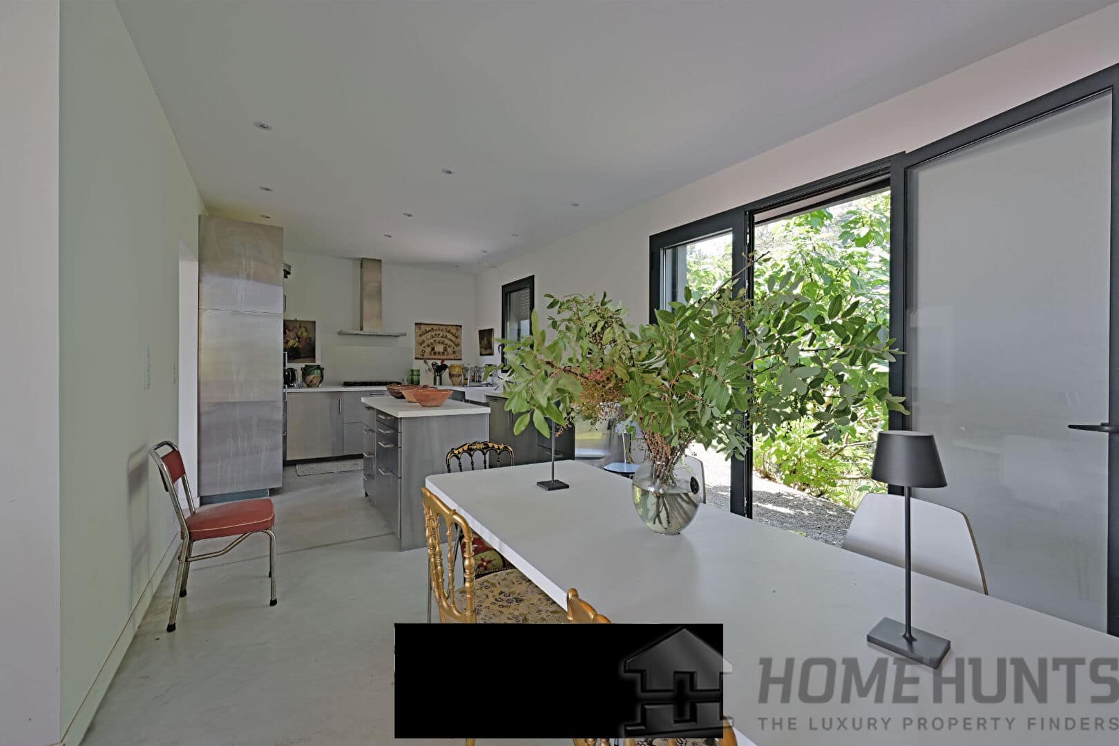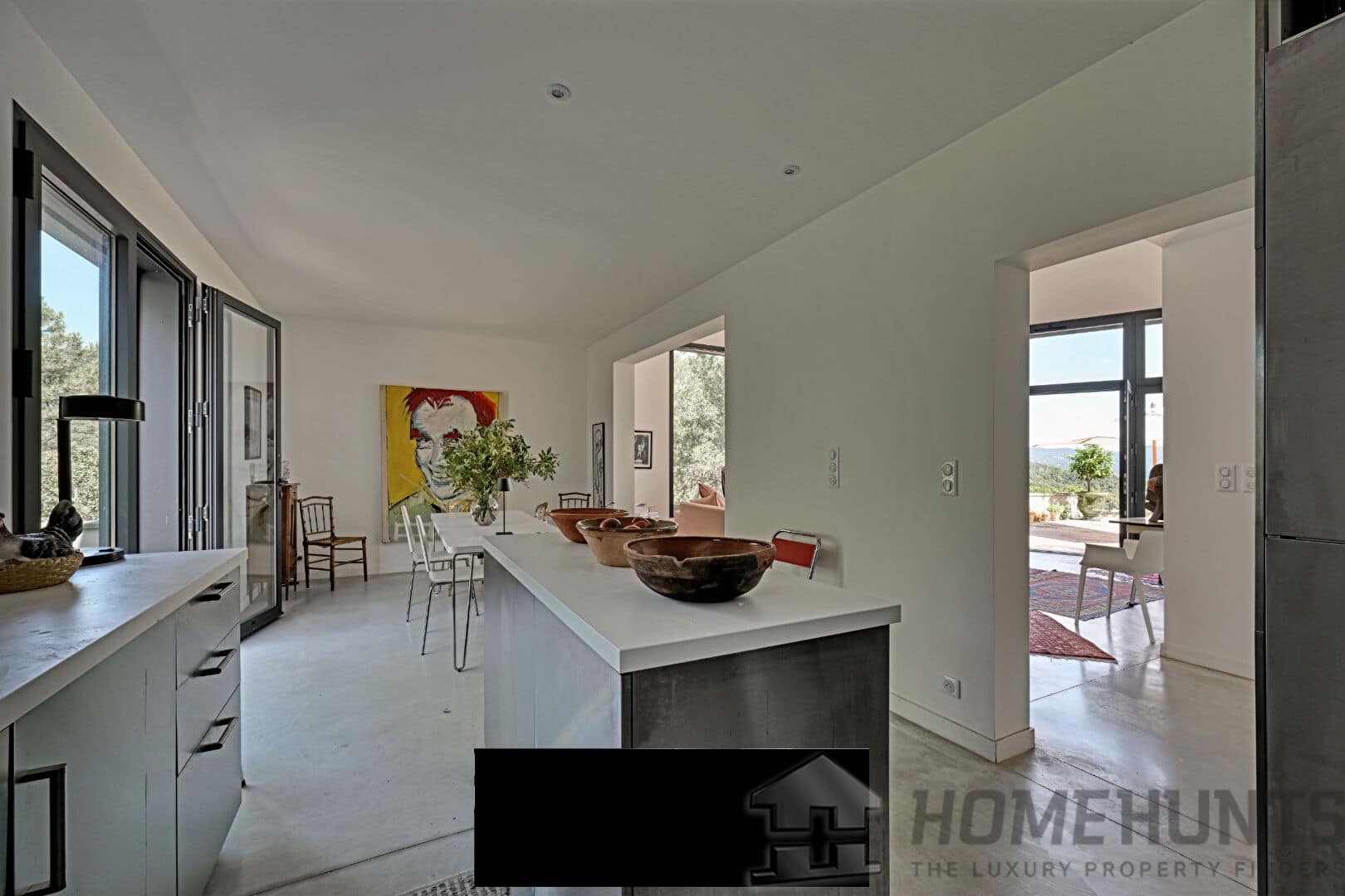This unique property seduces with its minimalist architecture, its clean lines and the quality of its materials, in an exceptional natural setting at the gateway to the Cevennes. The spacious and light-flooded living room opens generously to the exterior thanks to large bay windows. Its impressive 8-meter ceiling height gives the whole a feeling of volume and exceptional grandeur. The polished concrete floors reinforce the contemporary aesthetic of the place while providing an elegant visual continuity between the spaces. The living area, both convivial and refined, benefits from a fluid layout, designed for both everyday use and for entertaining. A high-end wood-burning stove adds a warm and elegant touch to winter evenings. The contemporary stainless steel kitchen with a central island blends perfectly into this harmonious ensemble. The true heart of the room, it invites both meal preparation and sharing, in a friendly and elegant atmosphere.