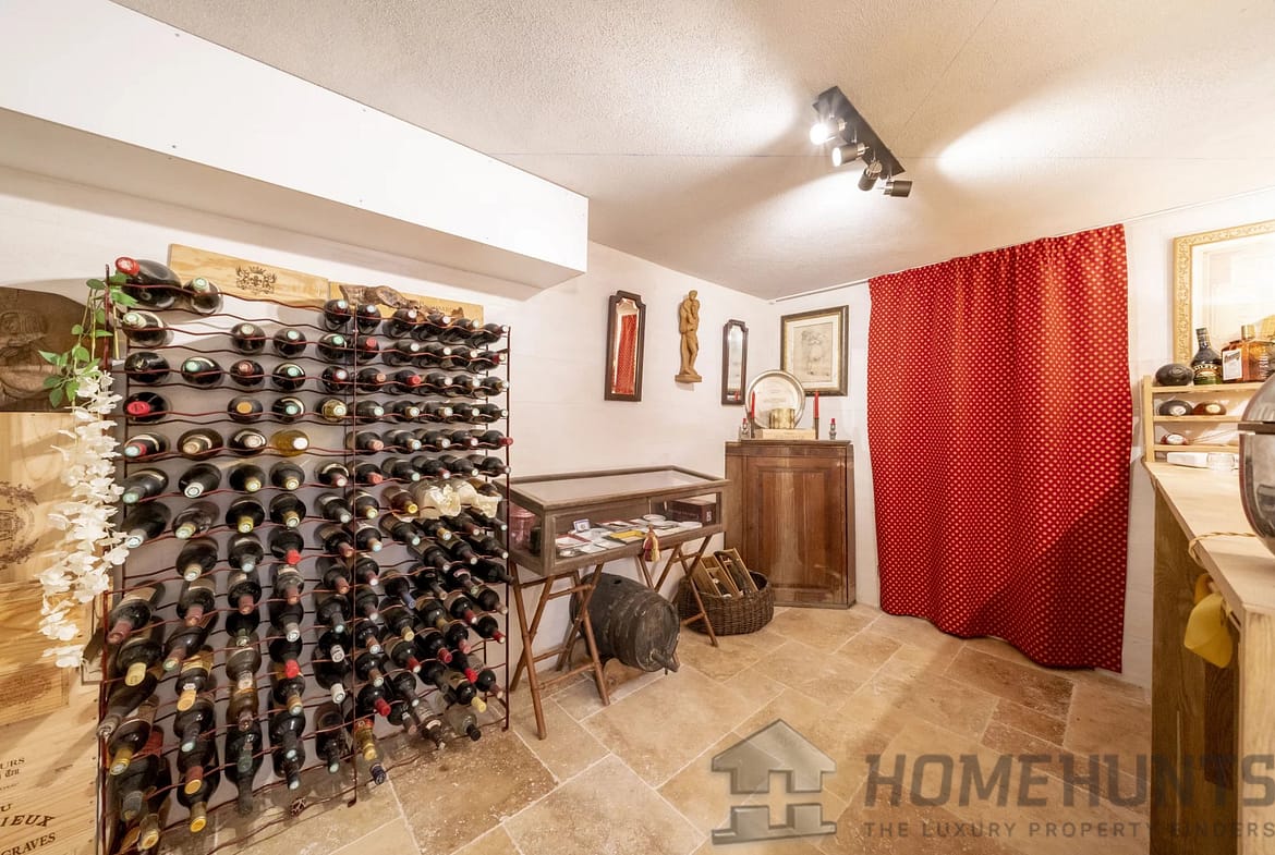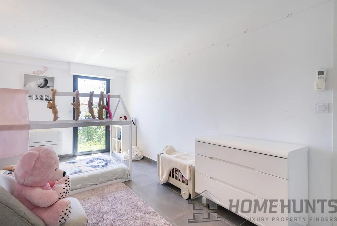 The basement includes a garage for one car, a well-equipped gym, storage spaces, a bedroom with a patio, a shower room with a hammam, a laundry room, a wine cellar, and a panic room. The first floor houses three bedrooms sharing a modern shower room.