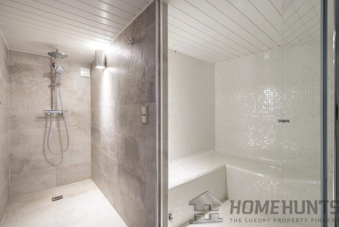 On the garden level, the spacious living area of approximately 50 sqm with an open kitchen welcomes you, alongside a guest WC. A bedroom with garden access, a dressing room, and an en-suite bathroom with a bathtub and shower add to the comfort. Additionally, an independent studio with a bedroom and shower room ensures privacy and convenience.