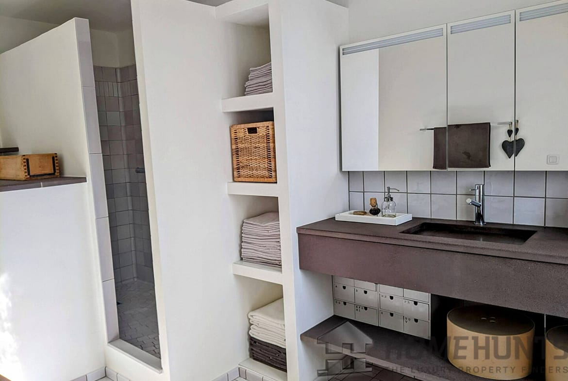 The 150 m2 bastide comprises an entrance hall, a fitted and equipped separate kitchen opening onto a dining room, two lounges, one with a pellet stove, a toilet and a utility/boiler room on the ground floor.