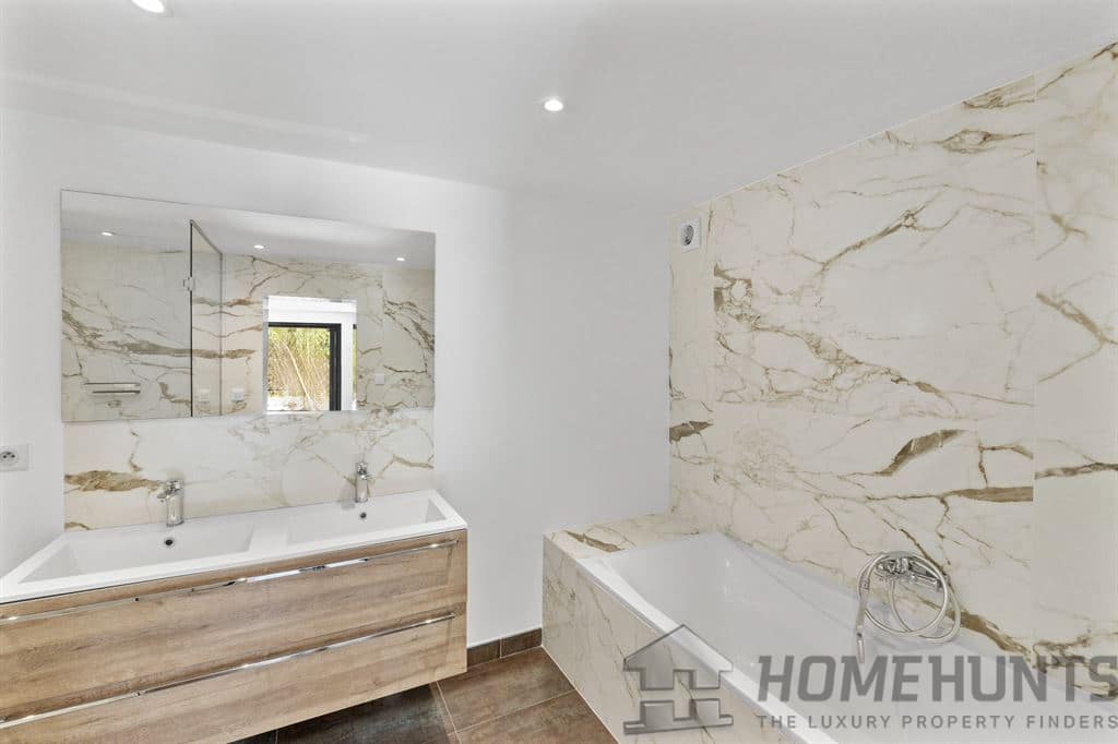 The ground floor features a spacious 70m2 living area with open kitchen and high ceilings, opening onto a south-facing terrace with open views of the Estérel hills and a glimpse of the sea. This level also includes a master suite with dressing and shower room, a second en suite bedroom, and guest toilets.