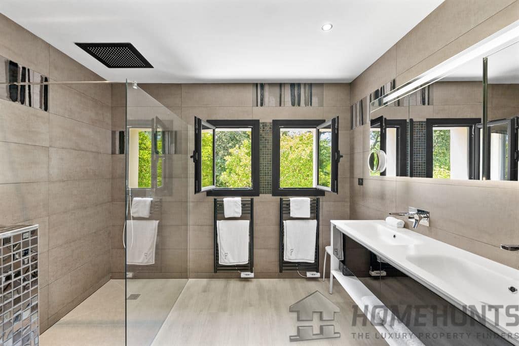 On the lower level: a large dressing room, bedroom, shower room, two additional bedrooms (one with en suite bath and shower), and a laundry room.