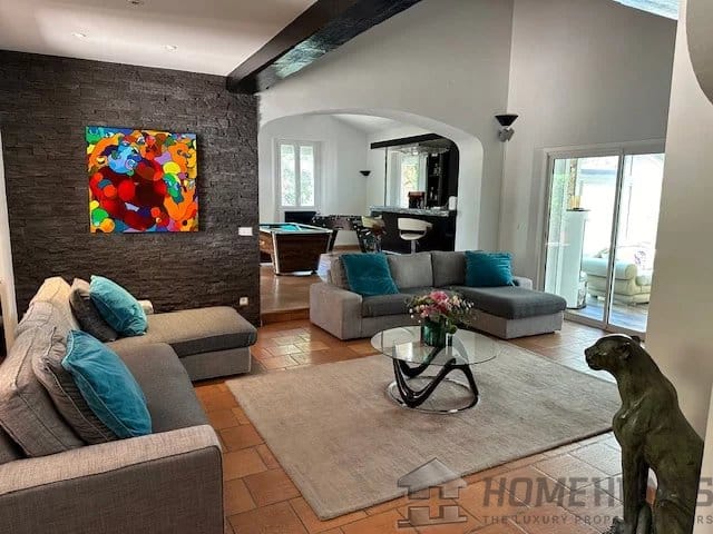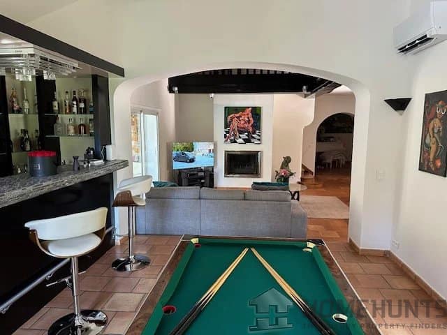 The main villa, spanning 300 m2, features generous, light-filled living spaces and high-end amenities: an impressive reception hall, a fully equipped independent kitchen, a double living room with billiards, bar and fireplace, and an elegant dining room. Two ground-floor en-suite bedrooms provide comfort and accessibility.
