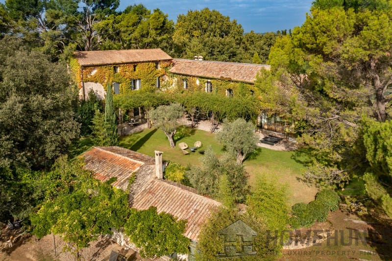 Authentic, 800 m2 farmhouse in an unobstructed position with exceptional views of the Dentelles de Montmirail and Mont Ventoux, set in 4.5 hectares of wooded parkland with pine and oak trees, an orchard and olive groves.