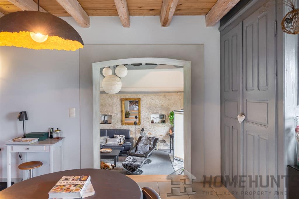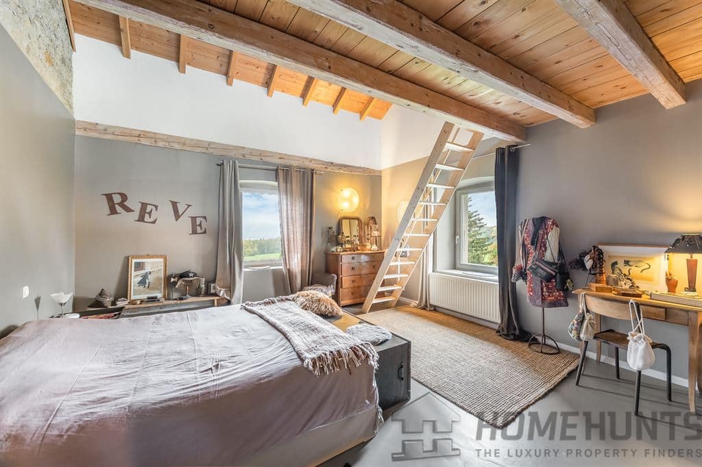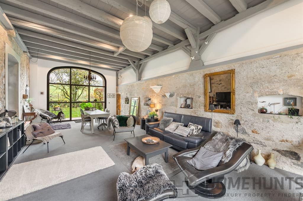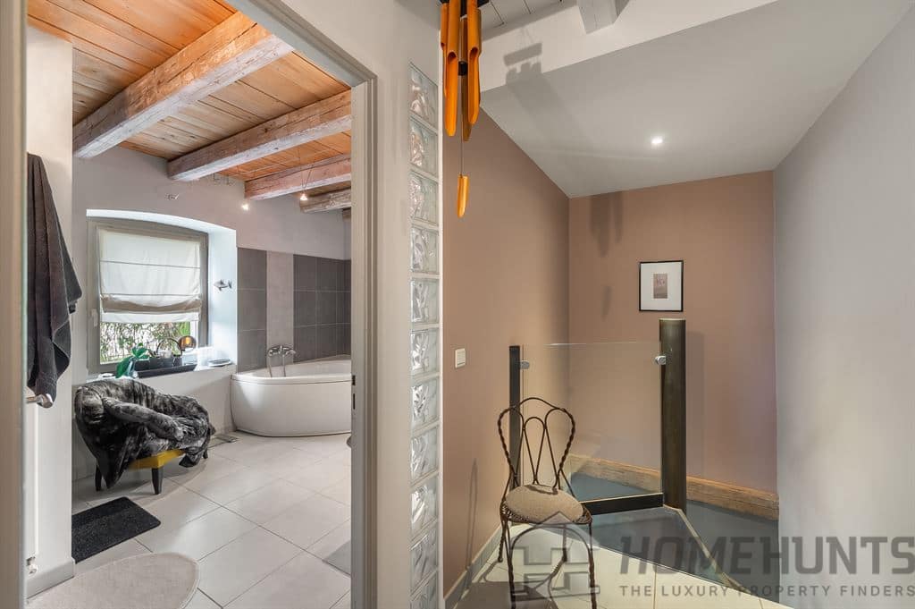 Offering 239 m2 of living space, it features a spacious and light-filled living area, enhanced by exposed stone and timber beams that lend the home its warm and characterful ambiance. The night area includes three bedrooms, one of which benefits from a mezzanine, as well as a bathroom and two shower rooms.