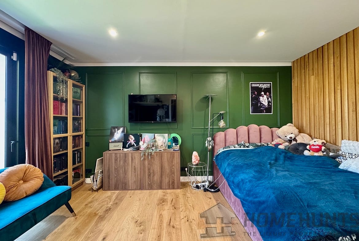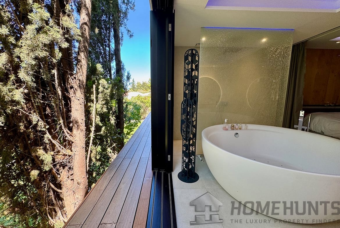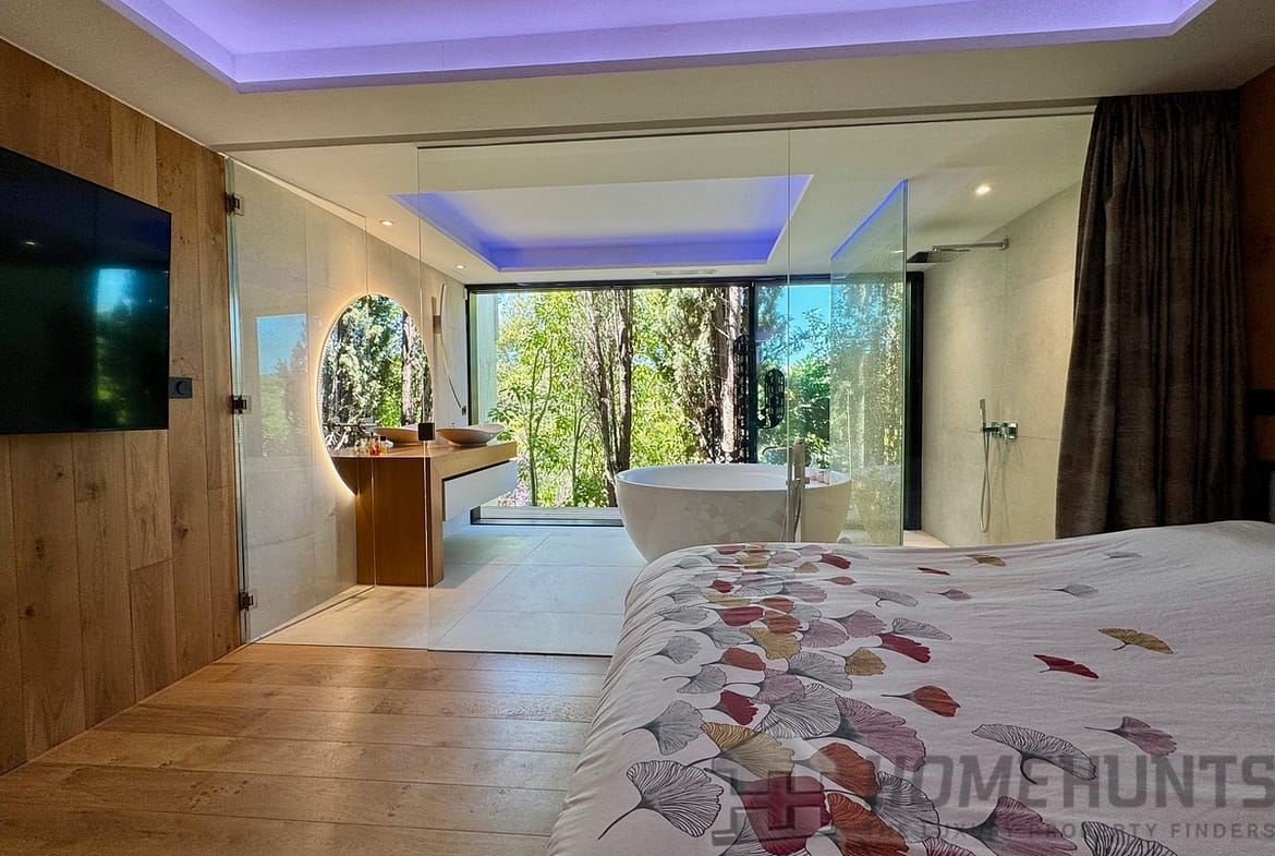 On the lower level, four generously sized bedrooms each benefit from their own private shower room and dressing area. The master suite offers a spa-like experience, with a luxurious bathroom and bay windows opening directly to nature.
