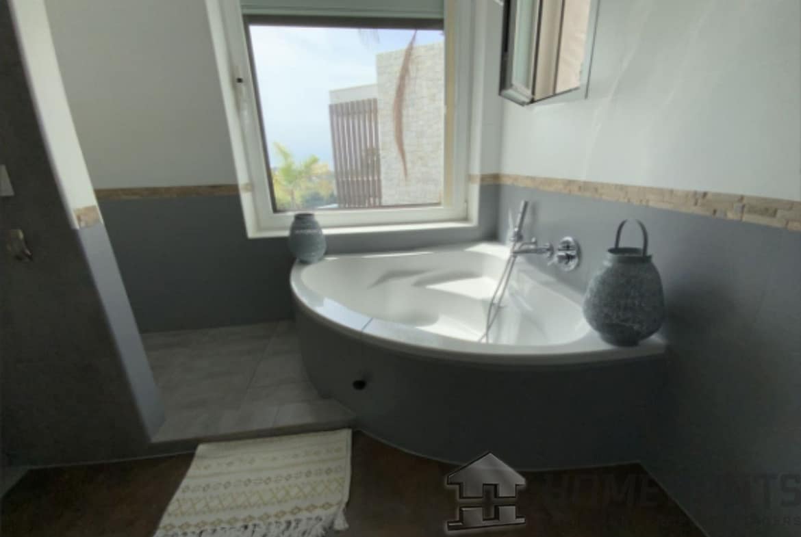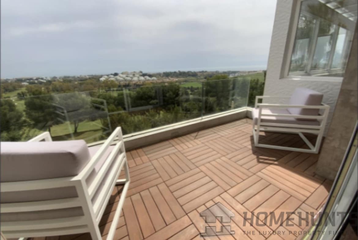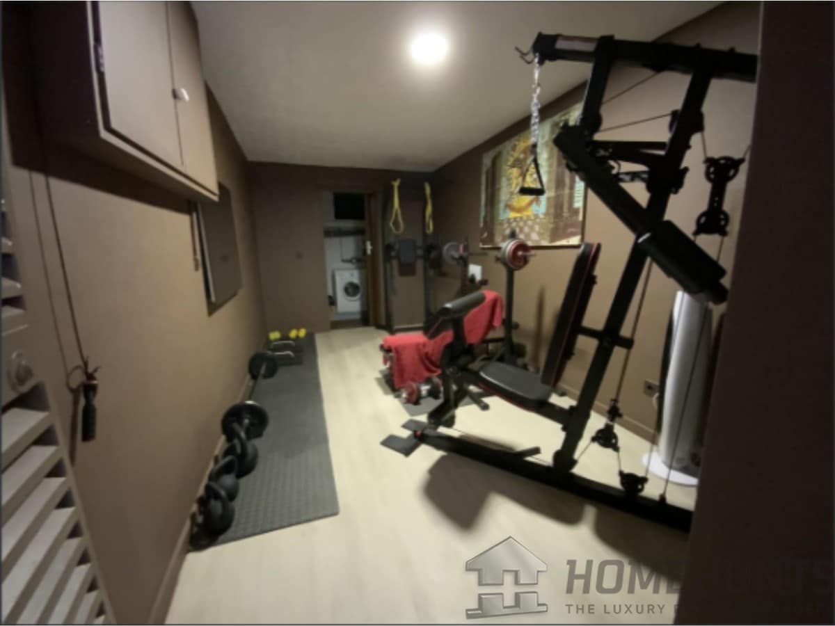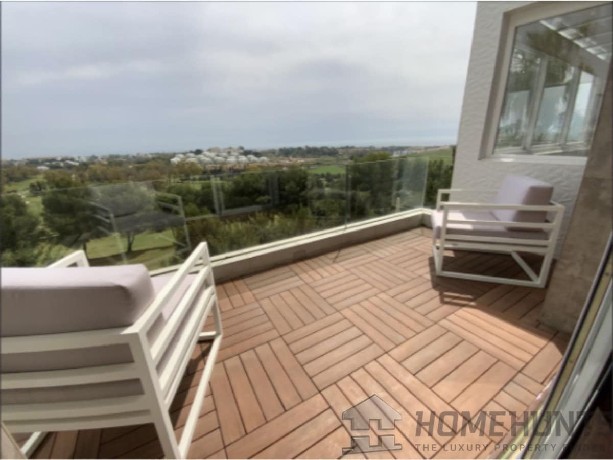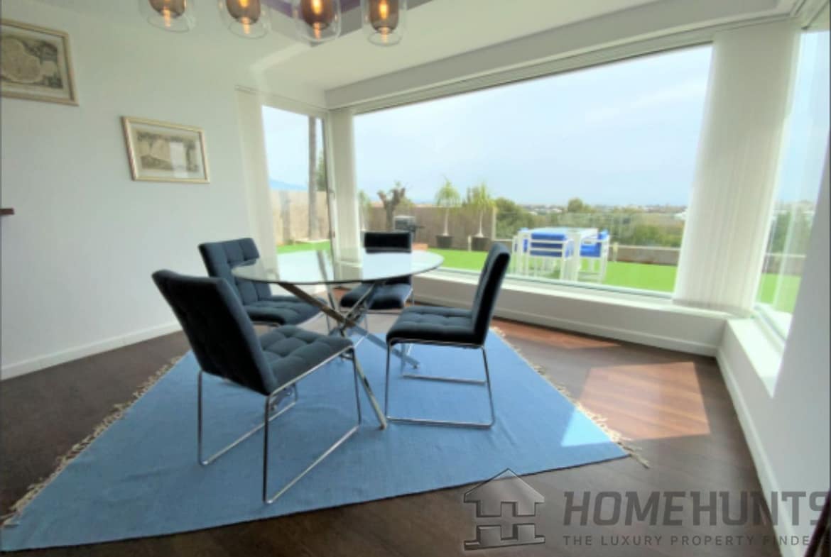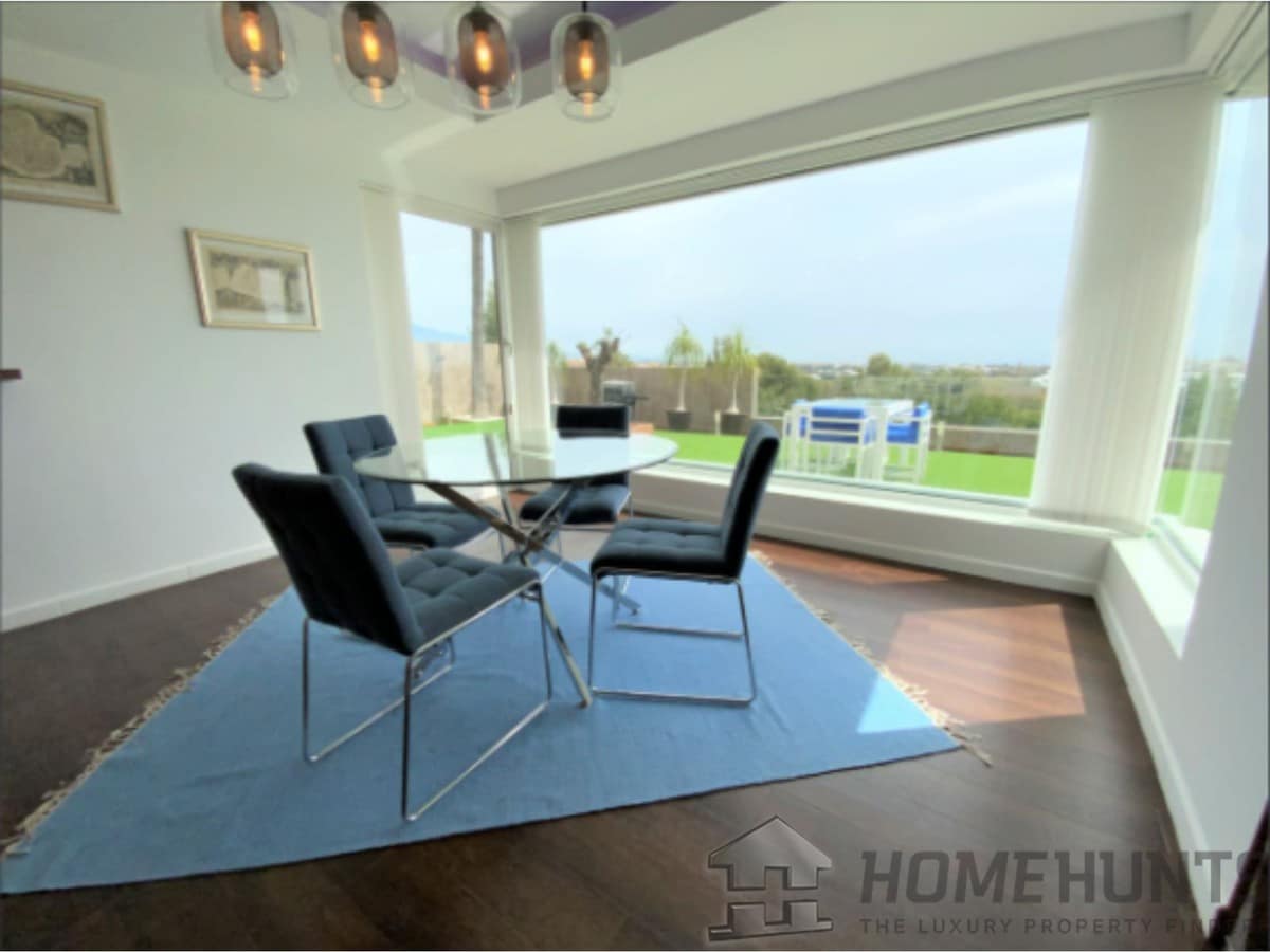 From the main entrance you get to an elegant living room with fireplace and separate dining room, both with access to the covered terrace. The large modern kitchen has room for a breakfast area. On the first floor is the master bedroom with access to the large terrace from which you have wonderful views. There are two more bedrooms on the same floor. There are hardwood floors on the first floor, the rest is marble floor, underfloor heating.