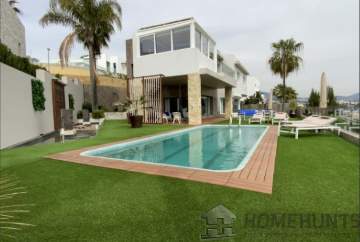 Mediterranean style villa on the frontline golf course of Atalaya with fantastic sea views and views to Gibraltar. 626m2 plot, all on one level, splendid garden, private pool and jacuzzi.