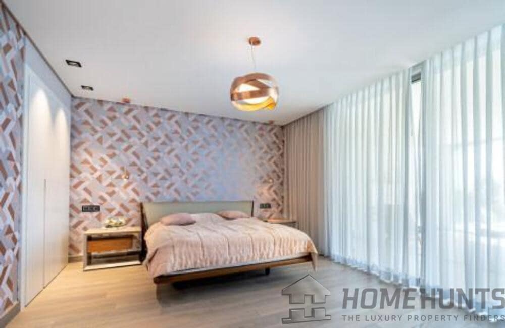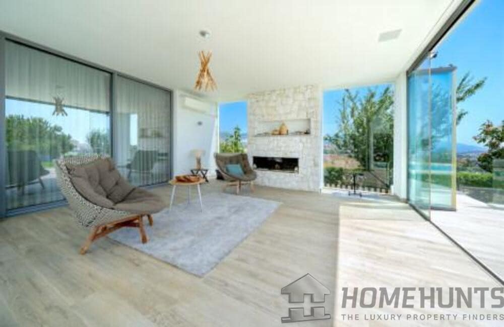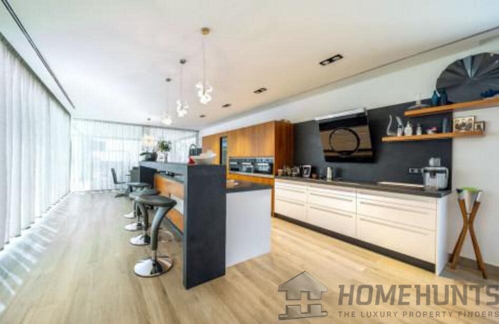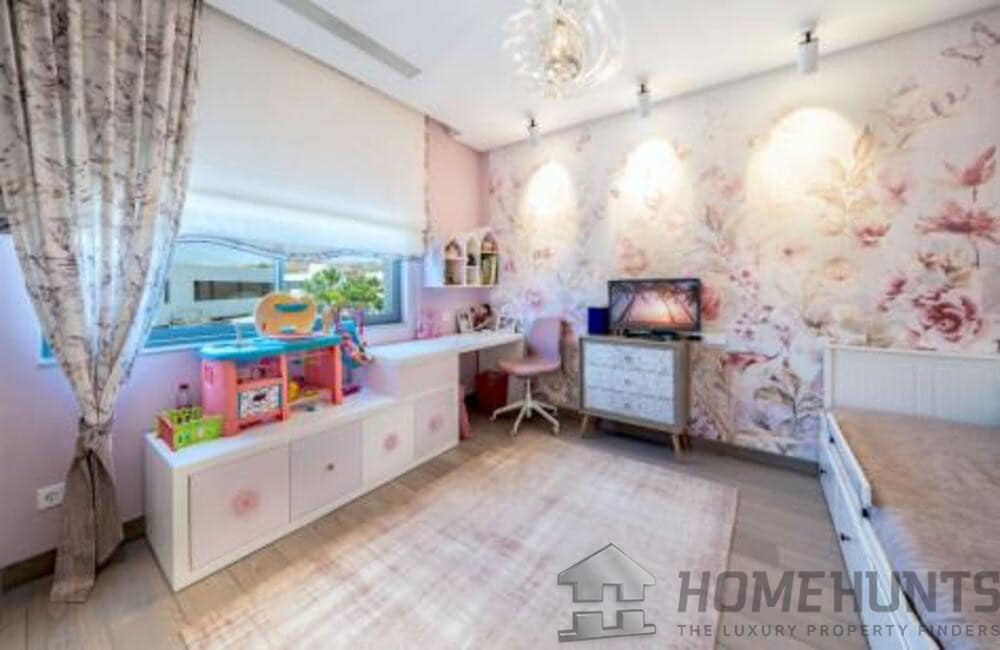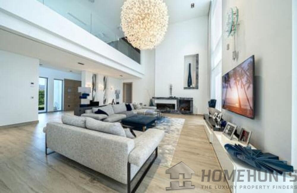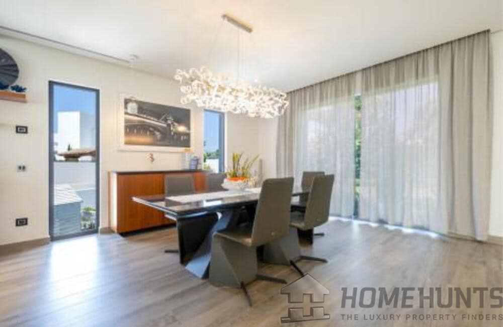 The villa, modern and elegantly designed, has 6 spacious bedrooms and 7 luxurious bathrooms. On the entrance floor there is a bright living room, an open concept kitchen with dining room, a bedroom with en suite bathroom and private terrace, as well as a guest toilet. The spacious terraces are ideal for entertainment, equipped with a barbecue area, swimming pool and a carefully cared garden.