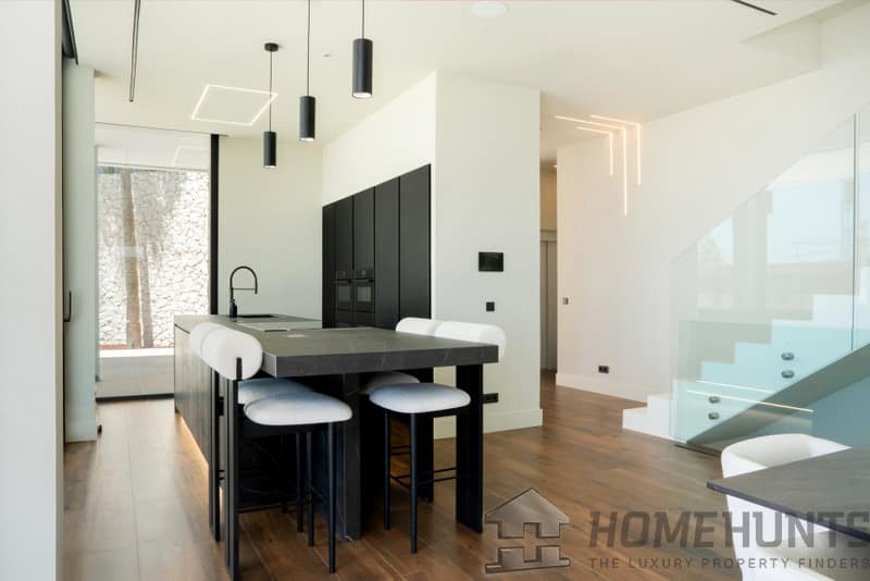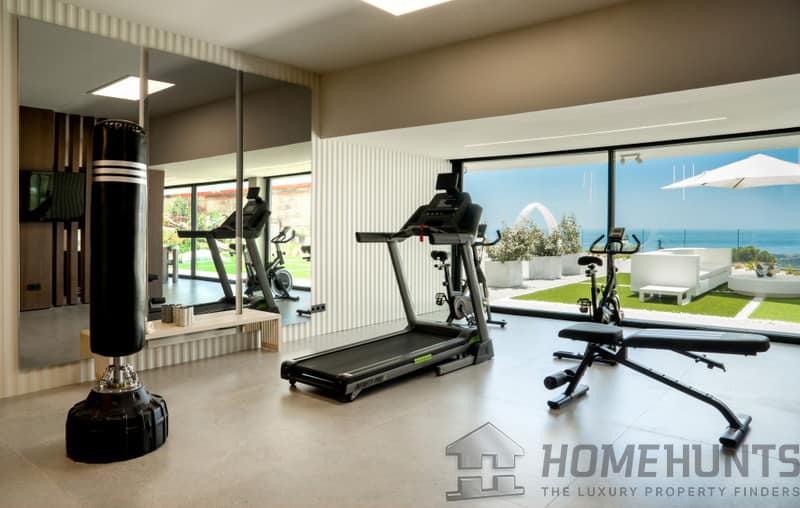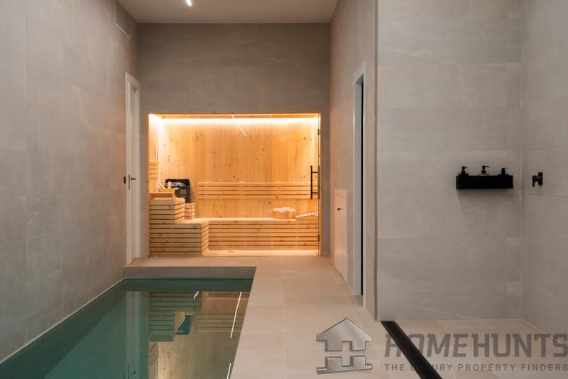 The spectacular basement level enjoys rare sea views and houses a full private wellness retreat, including a 24-meter heated indoor pool, sauna, a cold plunge pool, gym, and stylish bar. It also features a 16-seat cinema, bodega, second living room, and laundry area, ideal for both relaxation and entertaining.