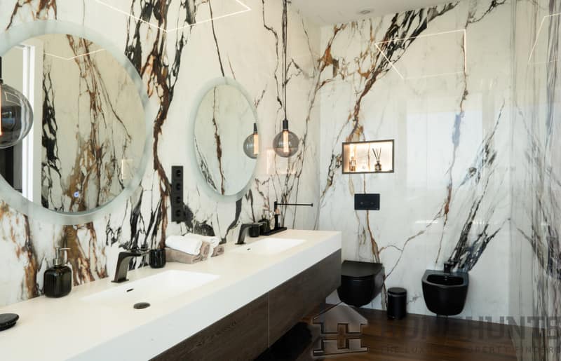 The open-plan layout is enhanced by top-quality materials, smart home technology, individual air conditioning/heating, and a private elevator connecting all floors.