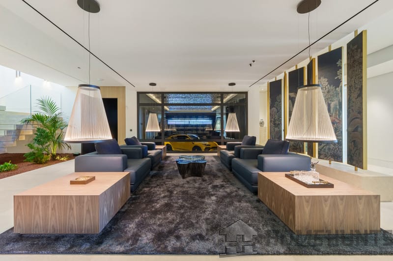 The lower level, encompassing nearly 800 m2, is dedicated to wellness and leisure. Naturally lit through floor-to-ceiling windows, it includes a cinema room, professional gym, playroom, spa with indoor pool and jacuzzi, and a private office. Three additional en-suite bedrooms – one with independent access and kitchenette – offer flexibility for guests or staff. A secure garage for eight cars with double EV charging completes the space.