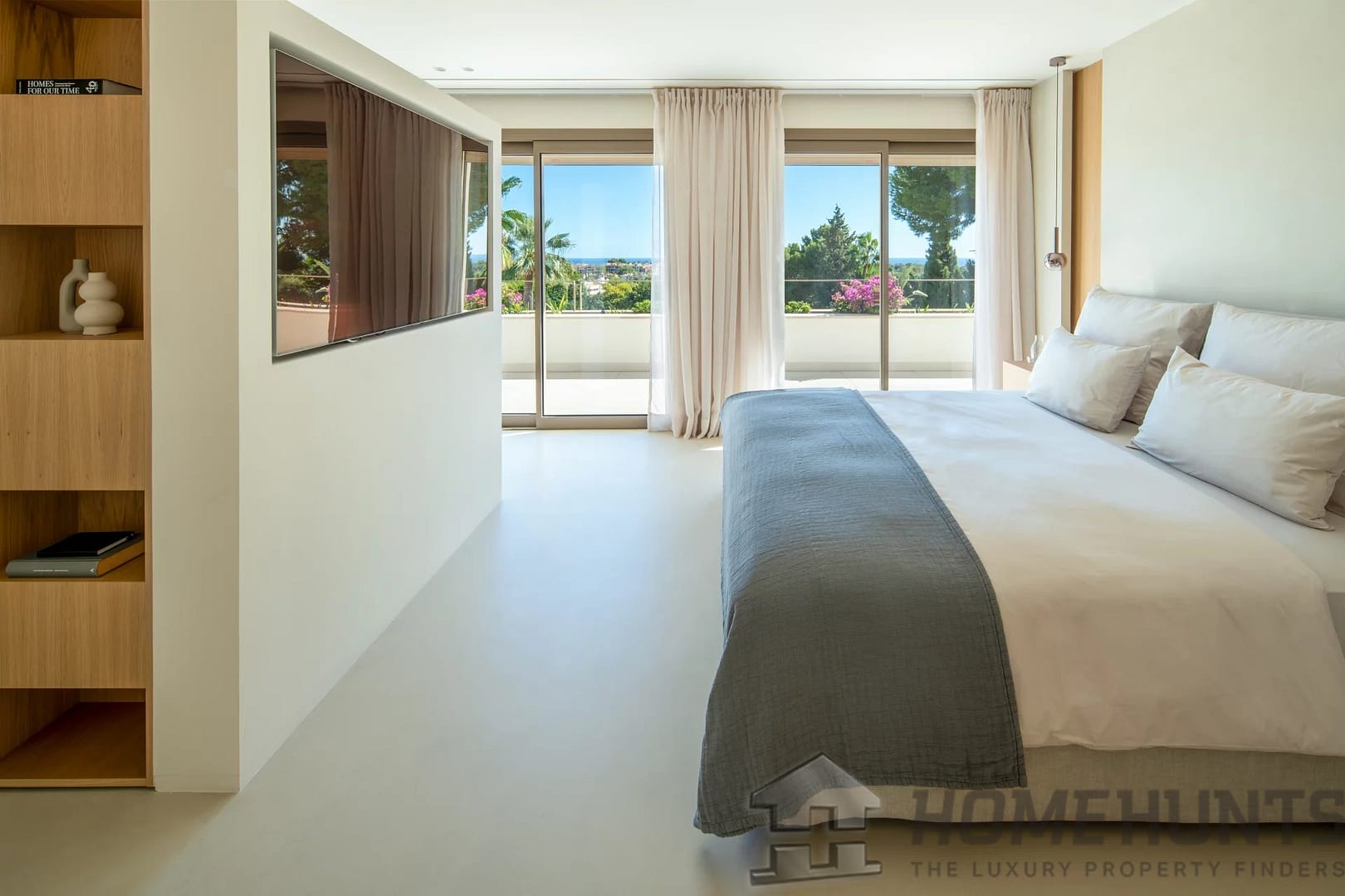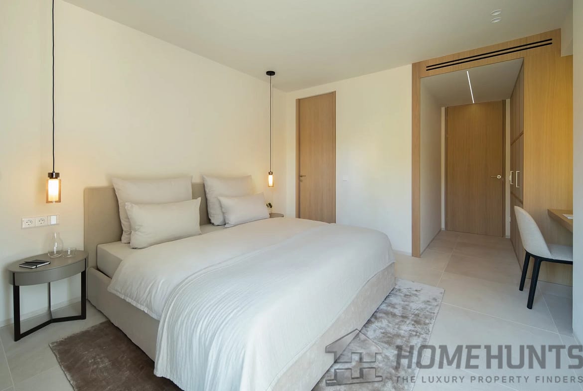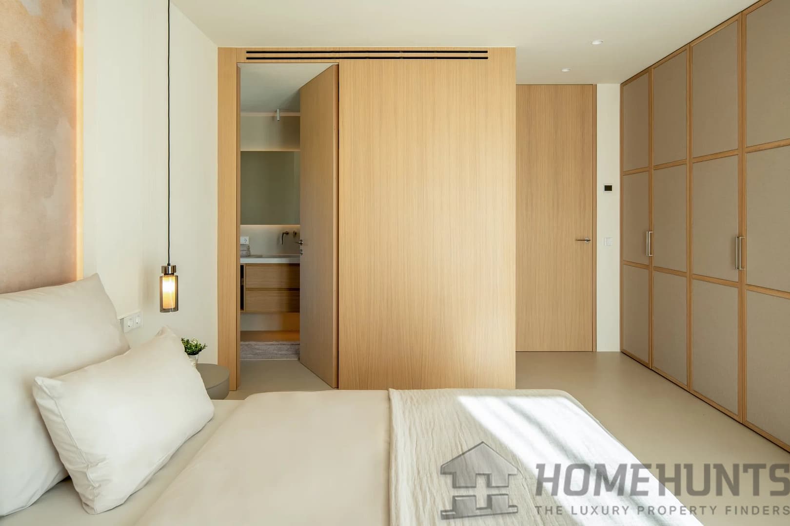 Upstairs is the luxurious master bedroom, which includes a bespoke dressing room and spa-like bathroom with panoramic sea views. From here there is access to a private balcony perfect for relaxing. Also on this same level are two additional bedrooms, each with its own en-suite bathroom, ensuring privacy and comfort for family or guests.
