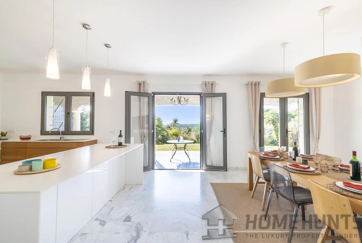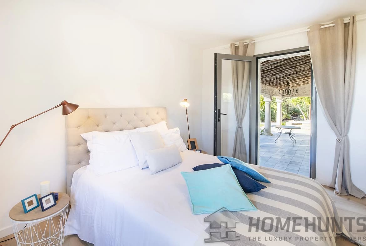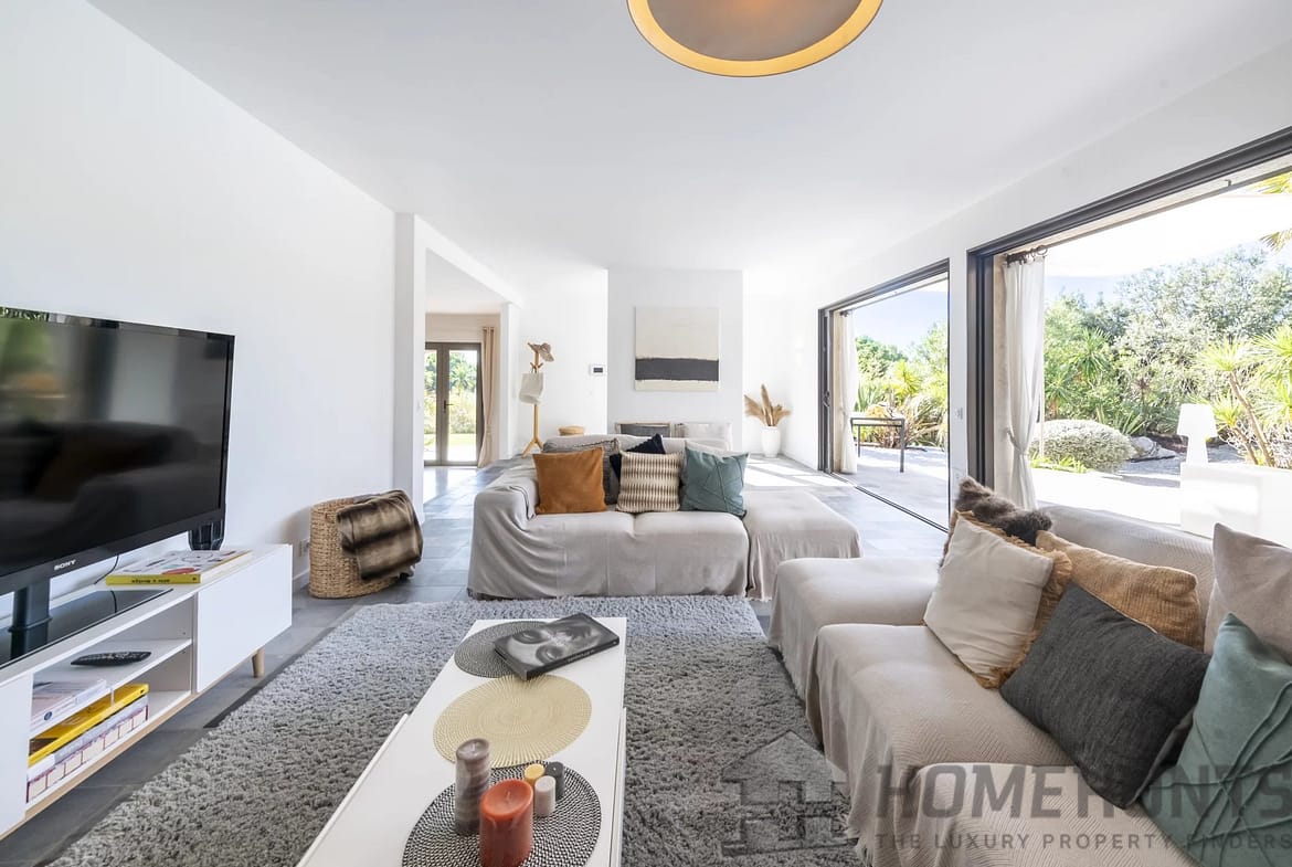 The villa features a bright and elegant living space with a fireplace, and large glass doors that open directly onto the beautiful garden, where you’ll find a pool, a lounge area, and a petanque court.