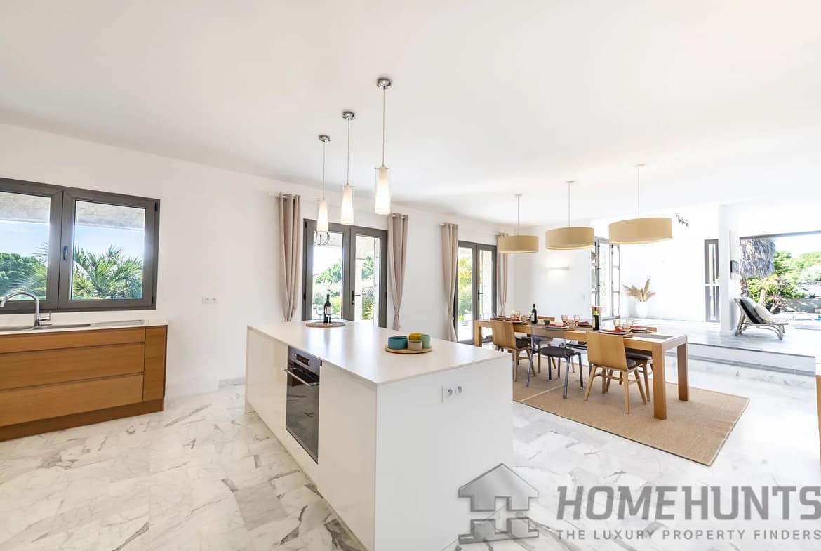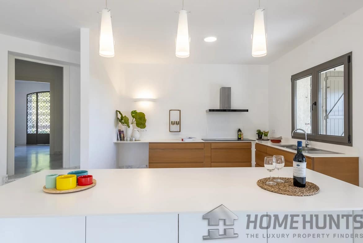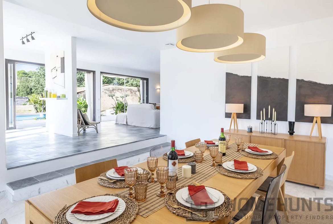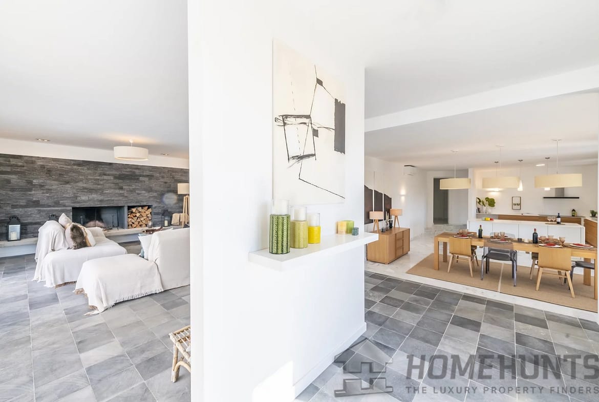 The villa features a bright and elegant living space with a fireplace, and large glass doors that open directly onto the beautiful garden, where you’ll find a pool, a lounge area, and a petanque court.