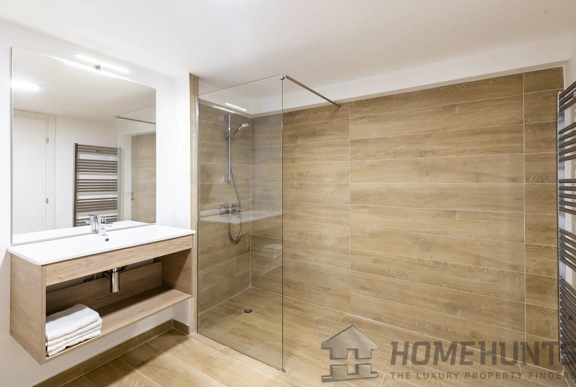 On the ground floor, an open kitchen leads to a charming dining area with access to a peaceful outdoor terrace. Two en-suite bedrooms with luxurious bathrooms, as well as a study that can be converted into a third bedroom, complete this level.