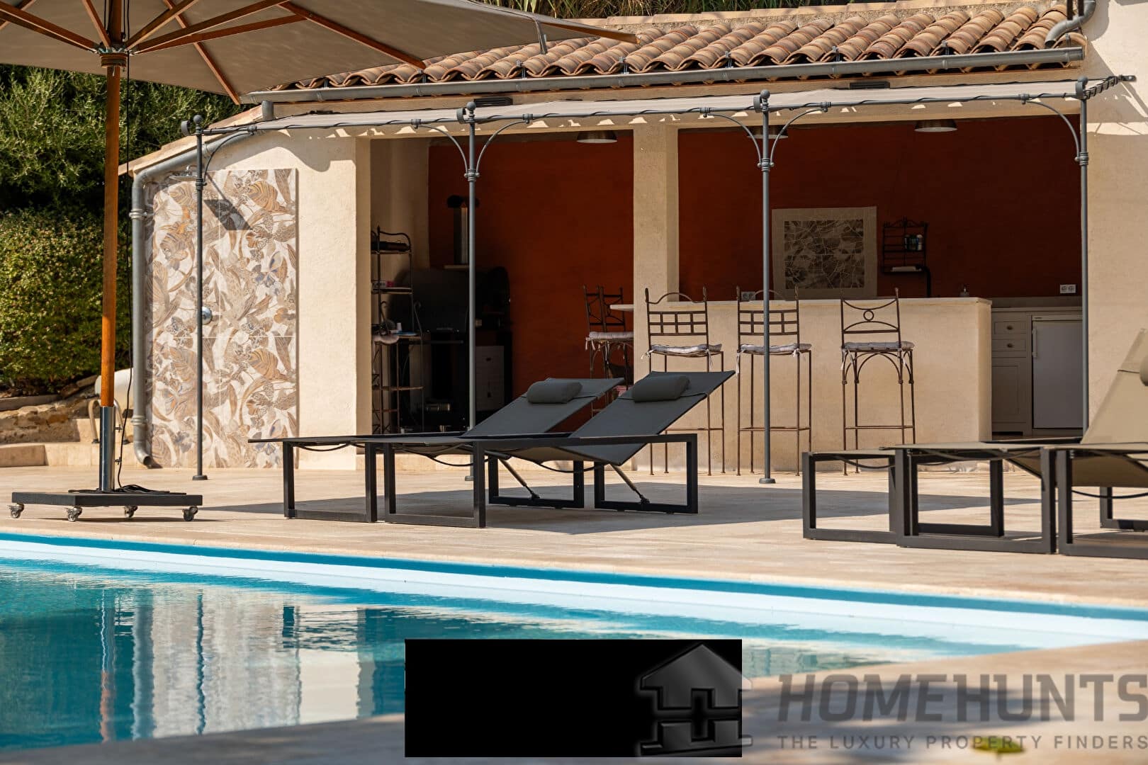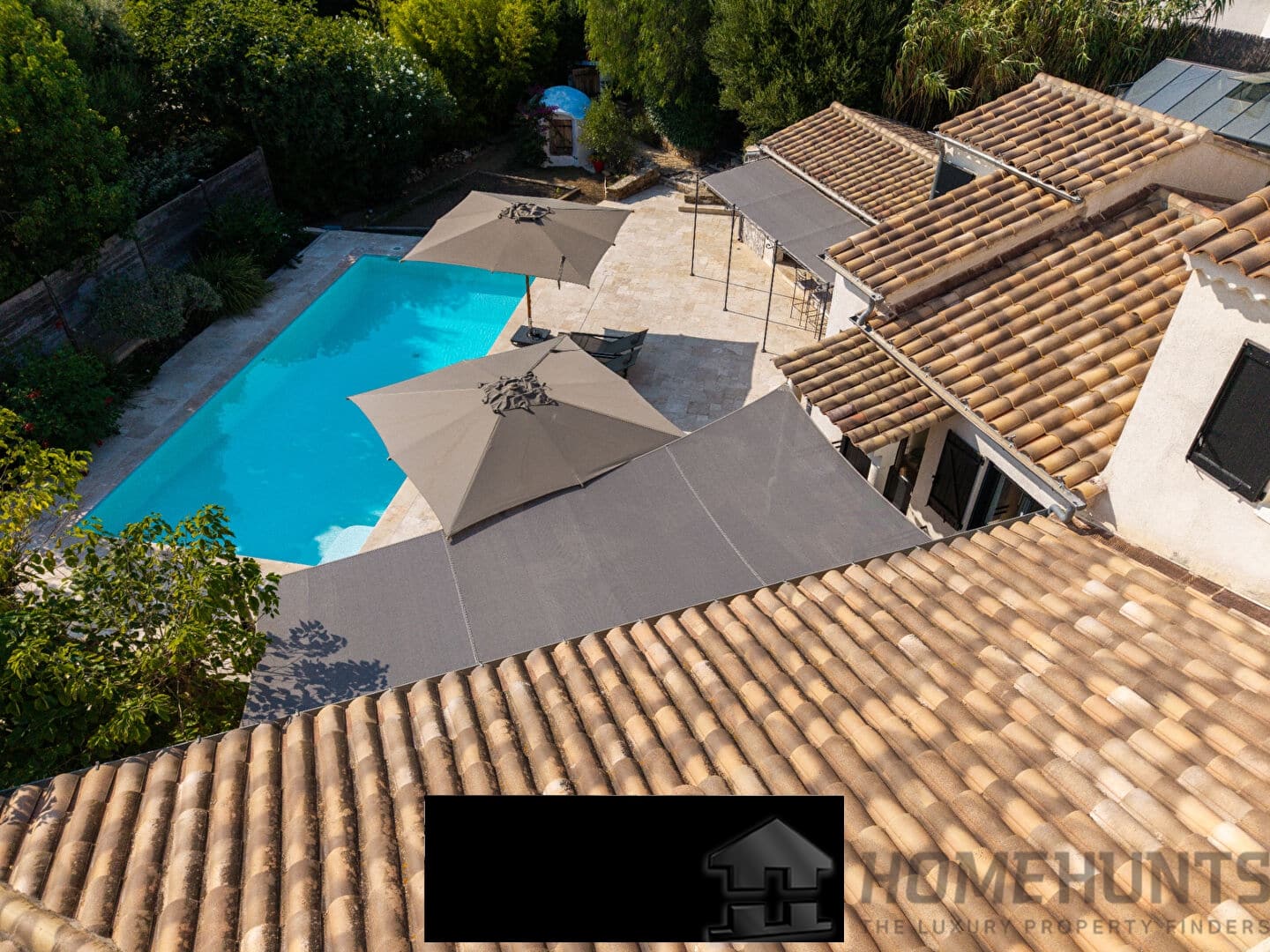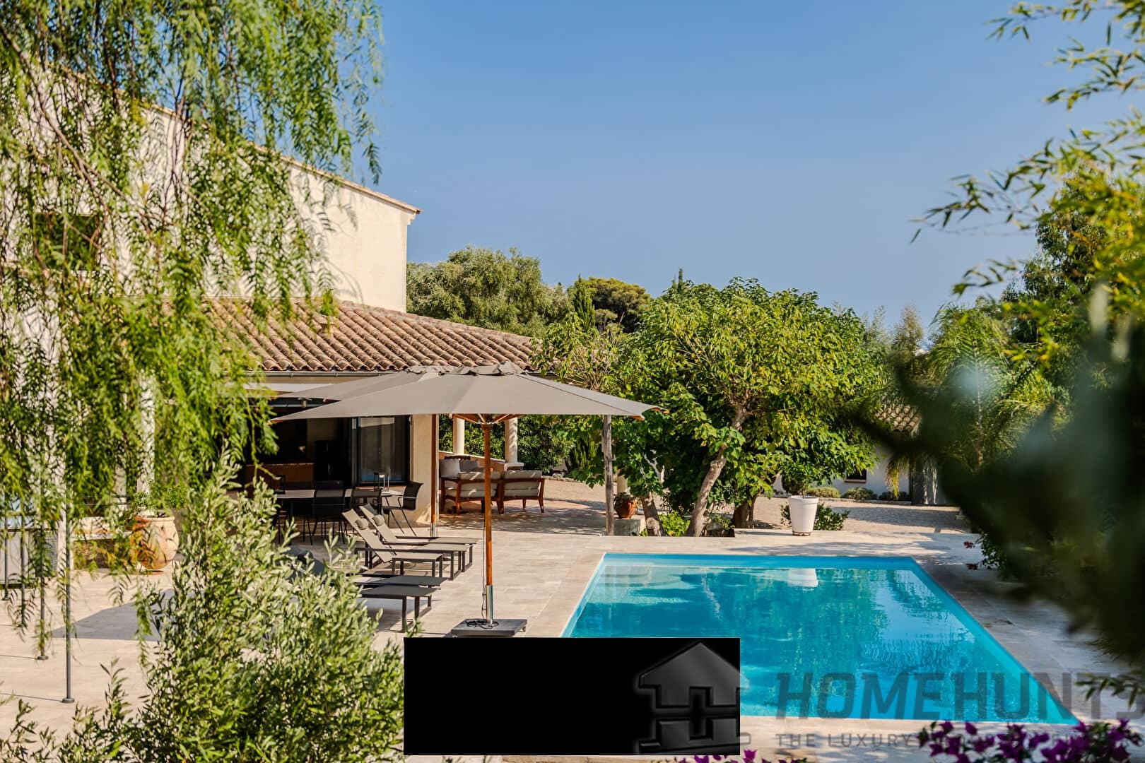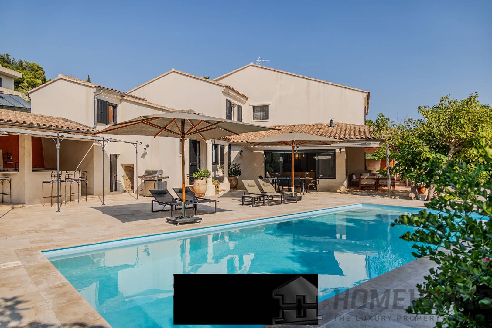 From the entrance, a vast paved courtyard and a very large garage that can accommodate several vehicles lead to the large travertine terrace and the main house, bordered by an elegant awning and its relaxation areas. The view opens onto the intimate swimming pool surrounded by exotic vegetation. In the background, a well for watering the vegetable garden faces the pool house, perfect for meals with friends on sunny days. Inside, the bright living room extends on one side into an open kitchen with exceptional worktops, and on the other into a convivial billiard room. On this same level are also an office and a guest bedroom with a private bathroom opening onto the terrace.