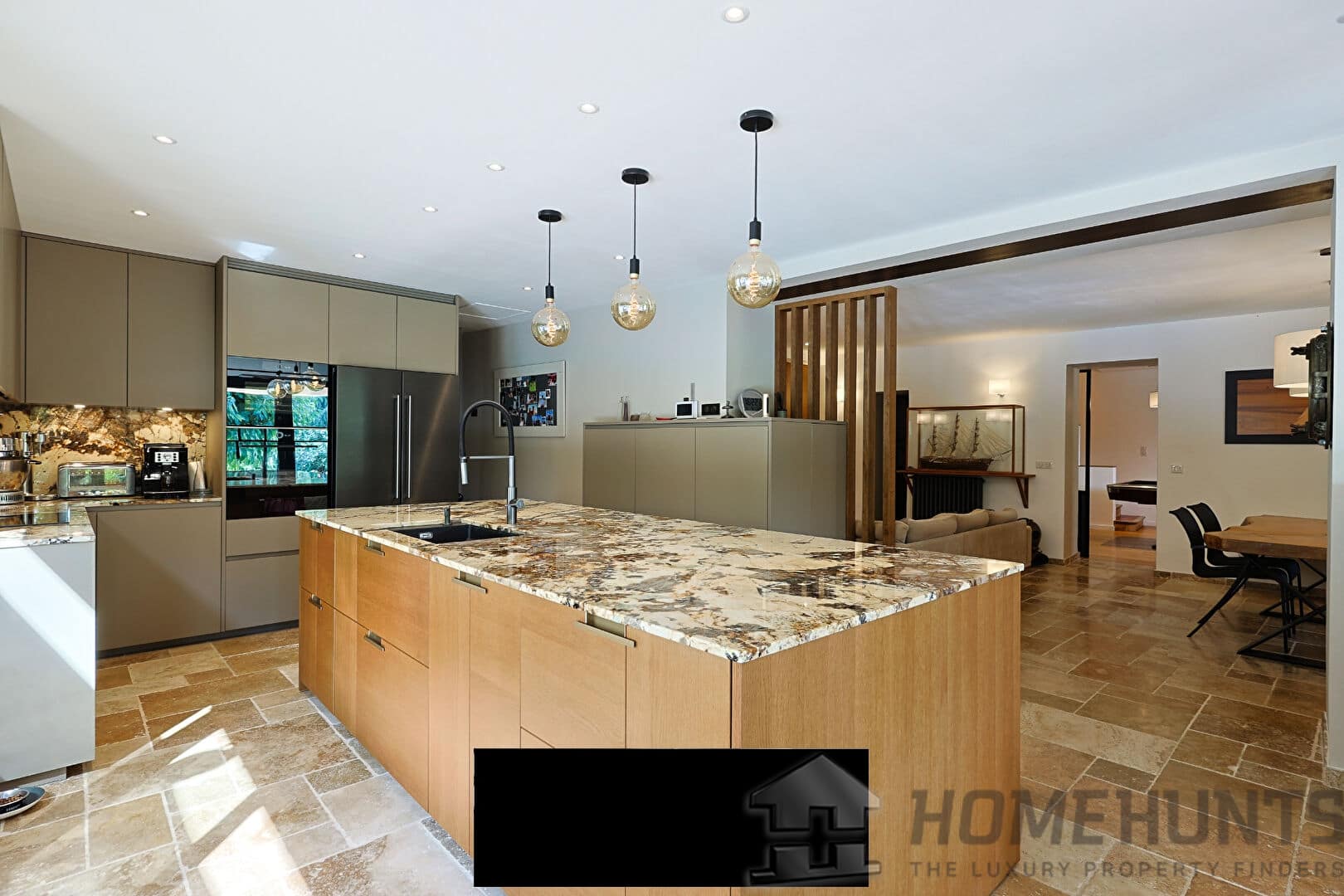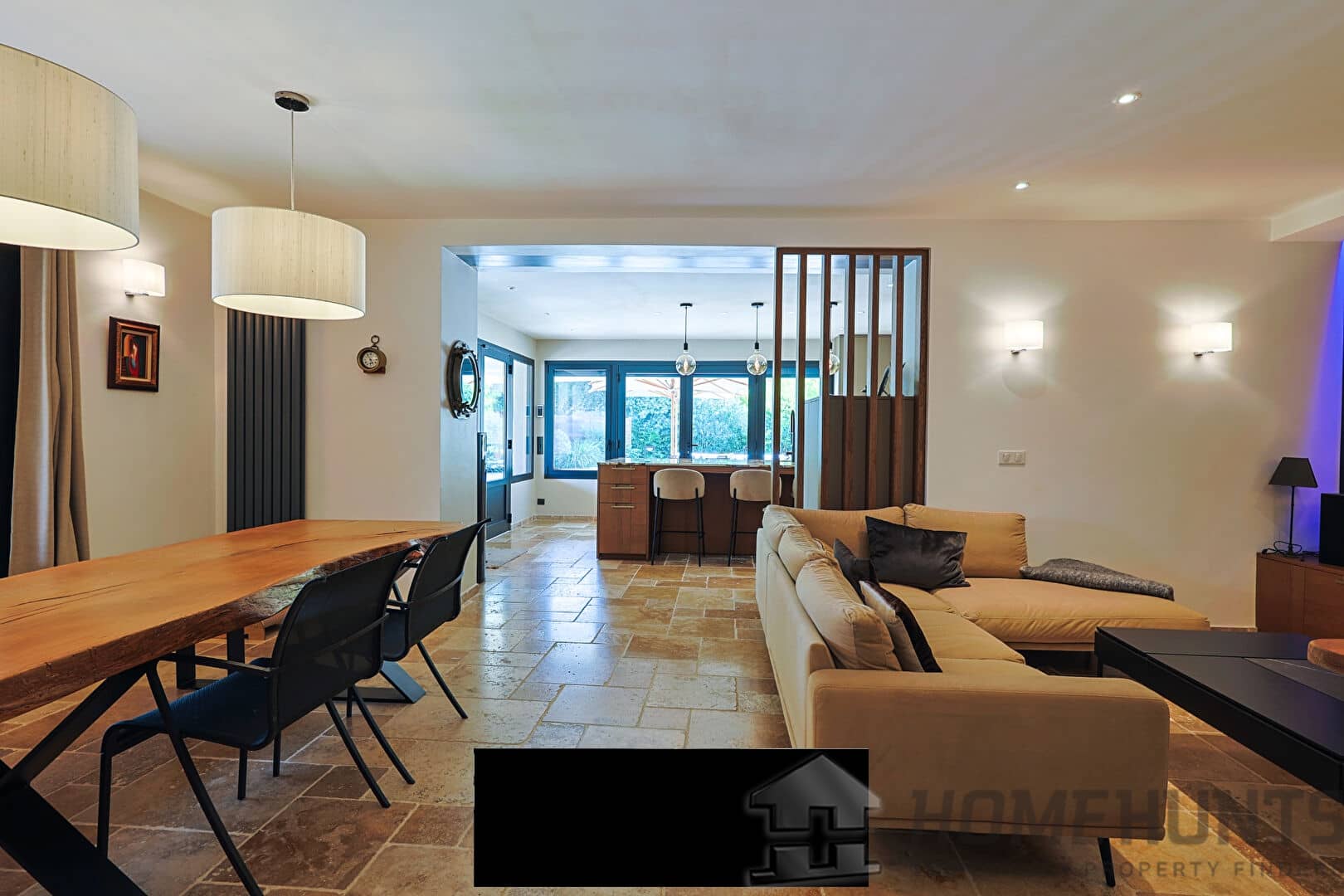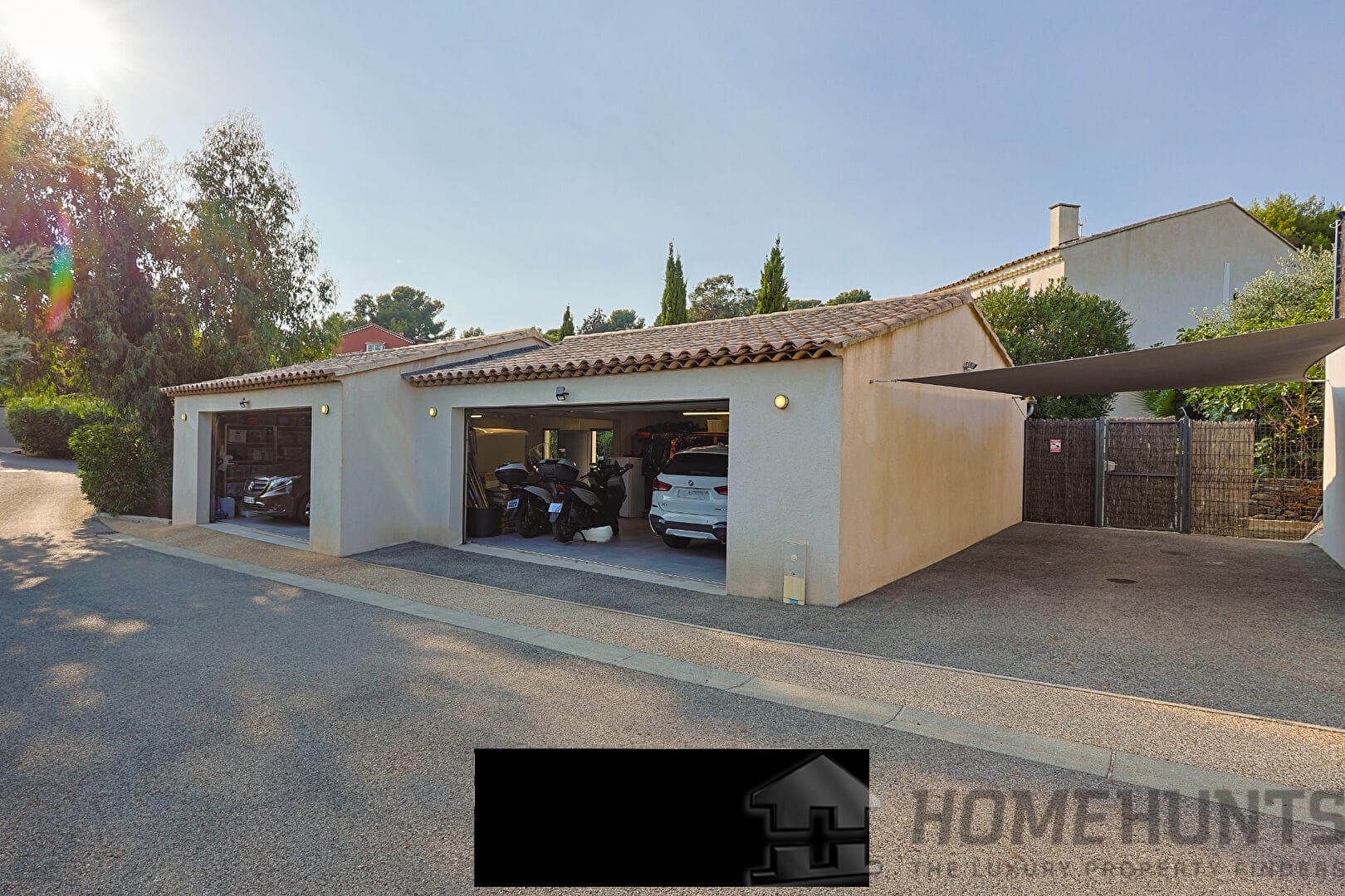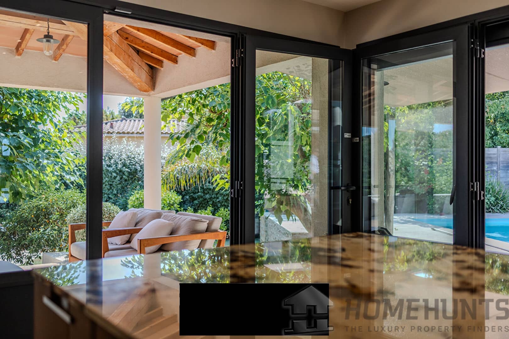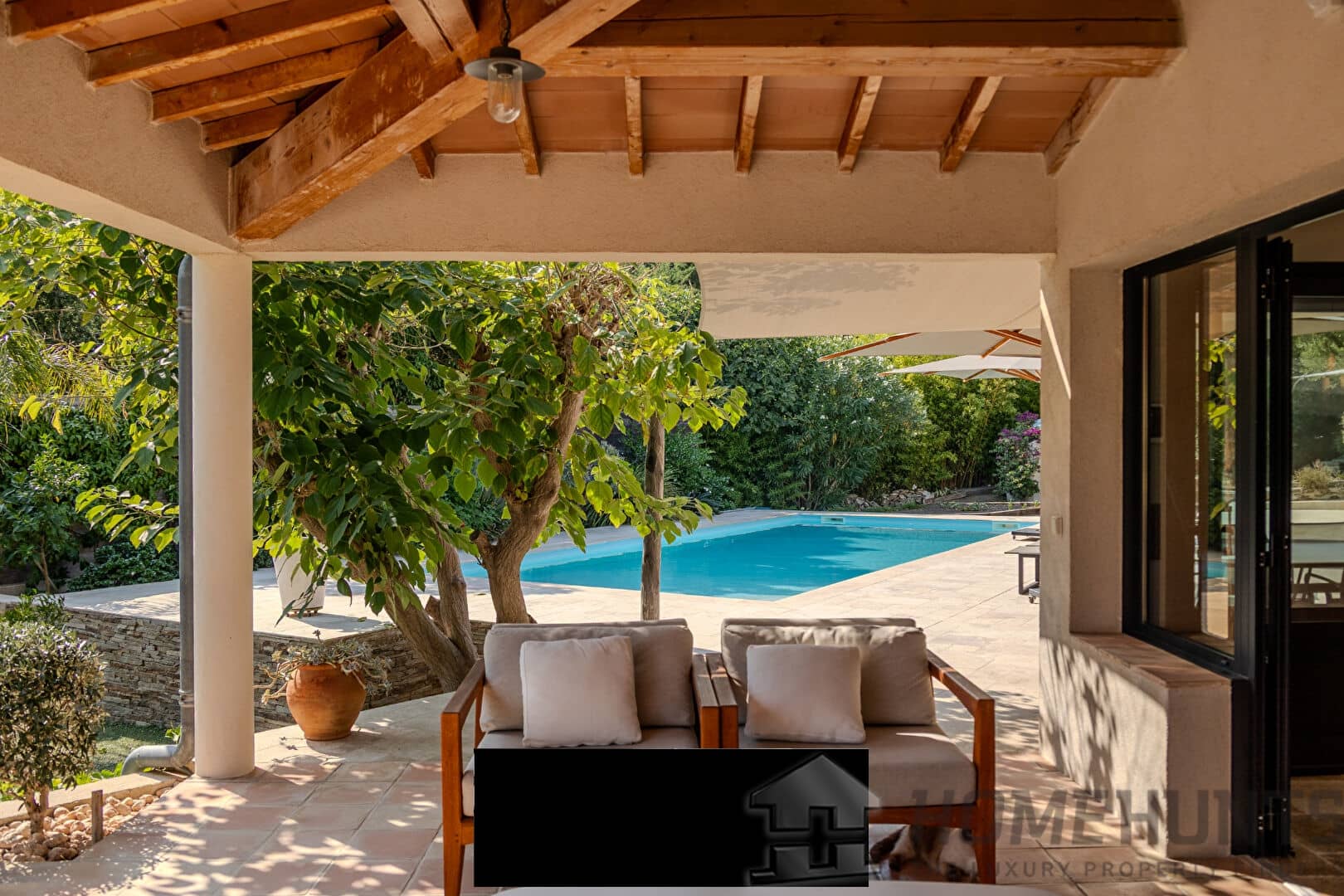 From the entrance, a vast paved courtyard and a very large garage that can accommodate several vehicles lead to the large travertine terrace and the main house, bordered by an elegant awning and its relaxation areas. The view opens onto the intimate swimming pool surrounded by exotic vegetation. In the background, a well for watering the vegetable garden faces the pool house, perfect for meals with friends on sunny days. Inside, the bright living room extends on one side into an open kitchen with exceptional worktops, and on the other into a convivial billiard room. On this same level are also an office and a guest bedroom with a private bathroom opening onto the terrace.