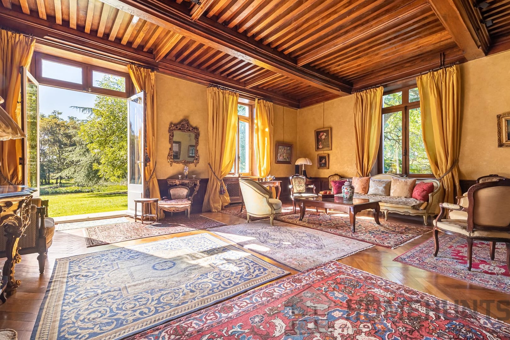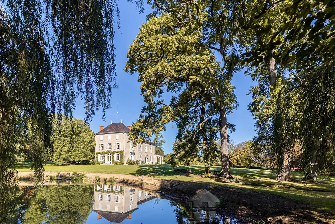 The parkland with its century-old trees, swimming pool, tennis court, lake and outbuilding complete this exceptional property.