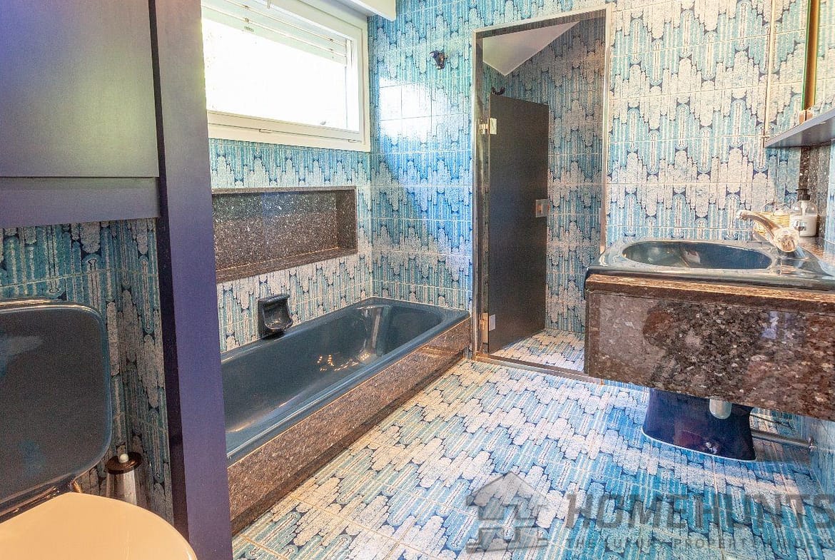 The lower level of the house is occupied by the garage area, ideal for up to four cars. A cellar and a sauna area on this level, from which we can directly access the large pool (85 m2) and the bar area.