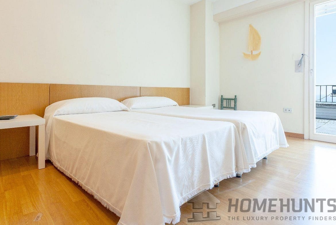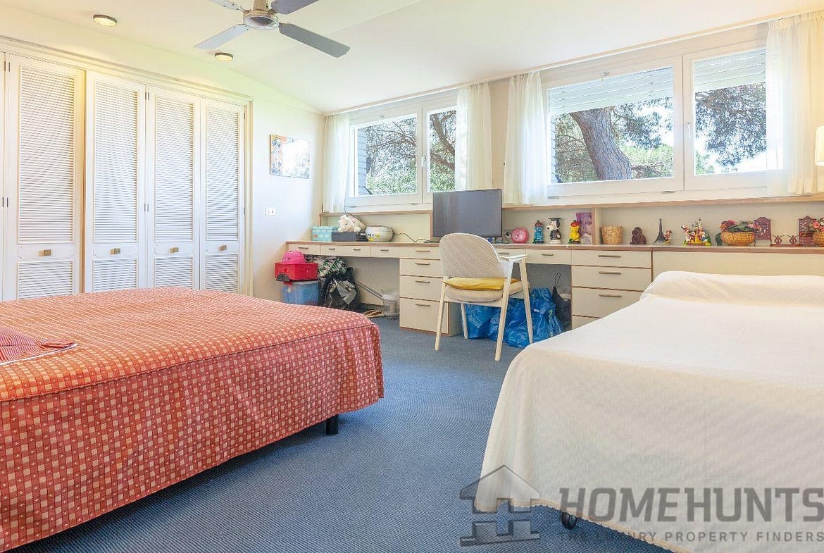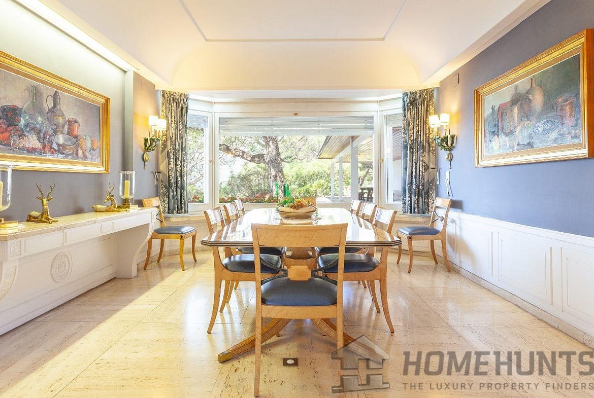 – Crossing the access porch to the house we access the entrance hall that leads us to the fabulous living room from which we can enjoy the wonderful views of the garden and the sea. Distributed on two levels, it is decorated with noble woods and has a fireplace, a bar area and from which you can access the large covered terrace. Attached to the living room we find the dining area and then the large kitchen, service area, laundry and pantry. On the upper floor there are a total of three double bedrooms with en-suite bathrooms, one of them as a master suite with dressing room and another four double bedrooms that share two full bathrooms with bathtub and shower.