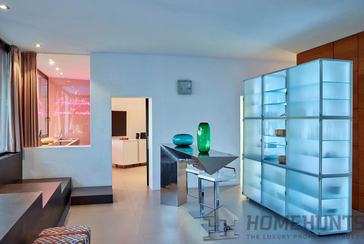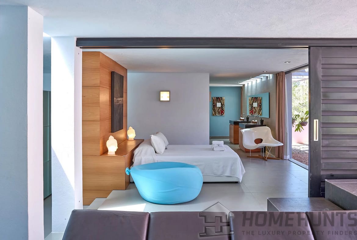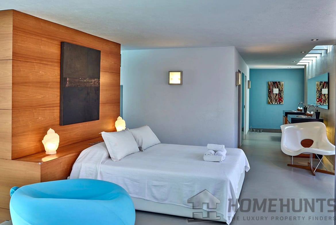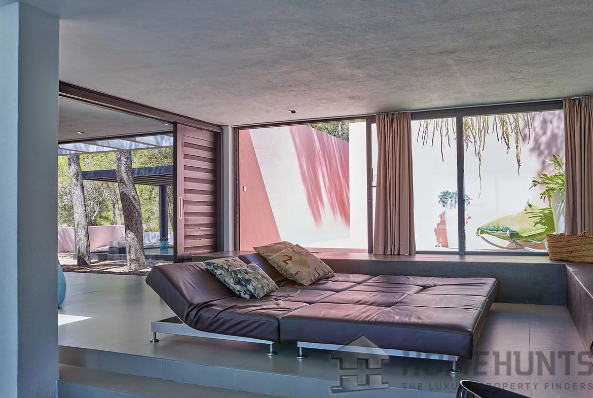 The exterior area features a large pool and jacuzzi, surrounded by sun loungers and umbrellas, as well as a barbecue area for outdoor dining. From the furnished terrace, you can enjoy the impressive sea view, making it the ideal spot to enjoy Ibiza’s famous sunsets.
