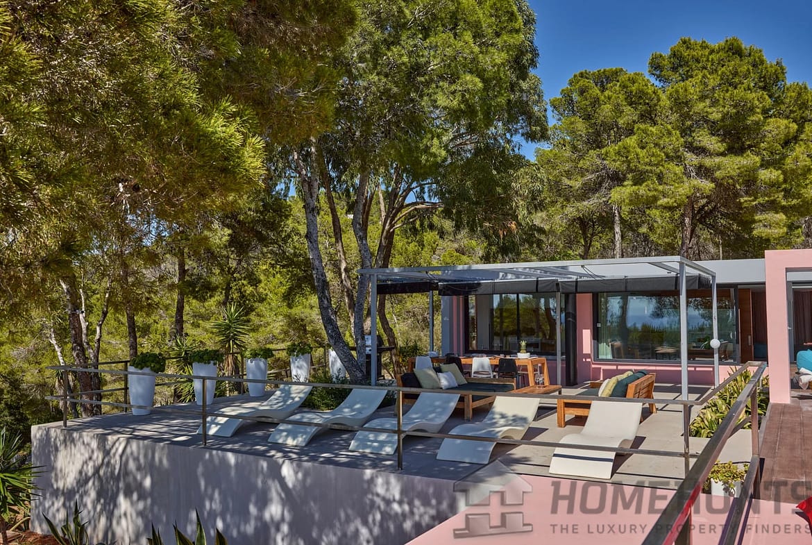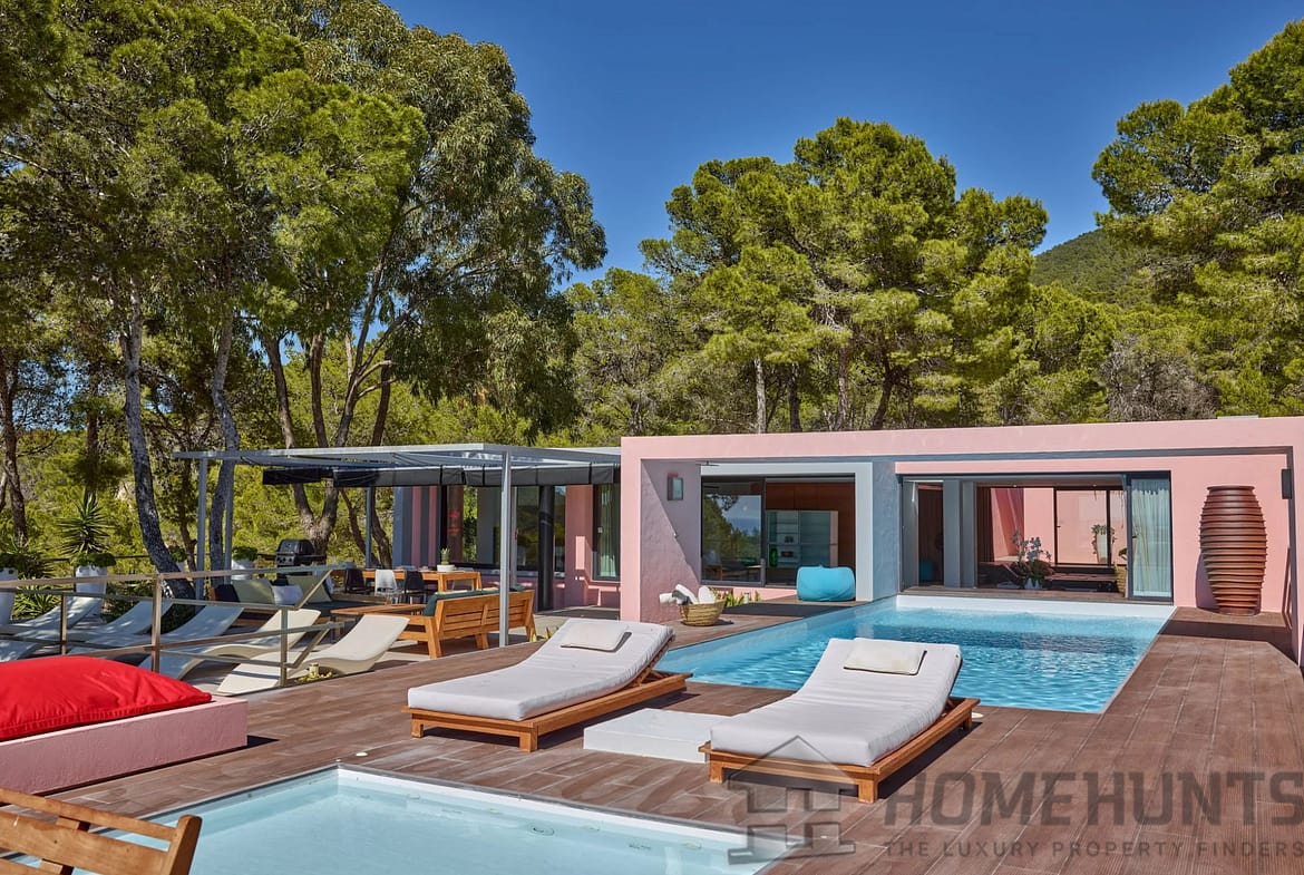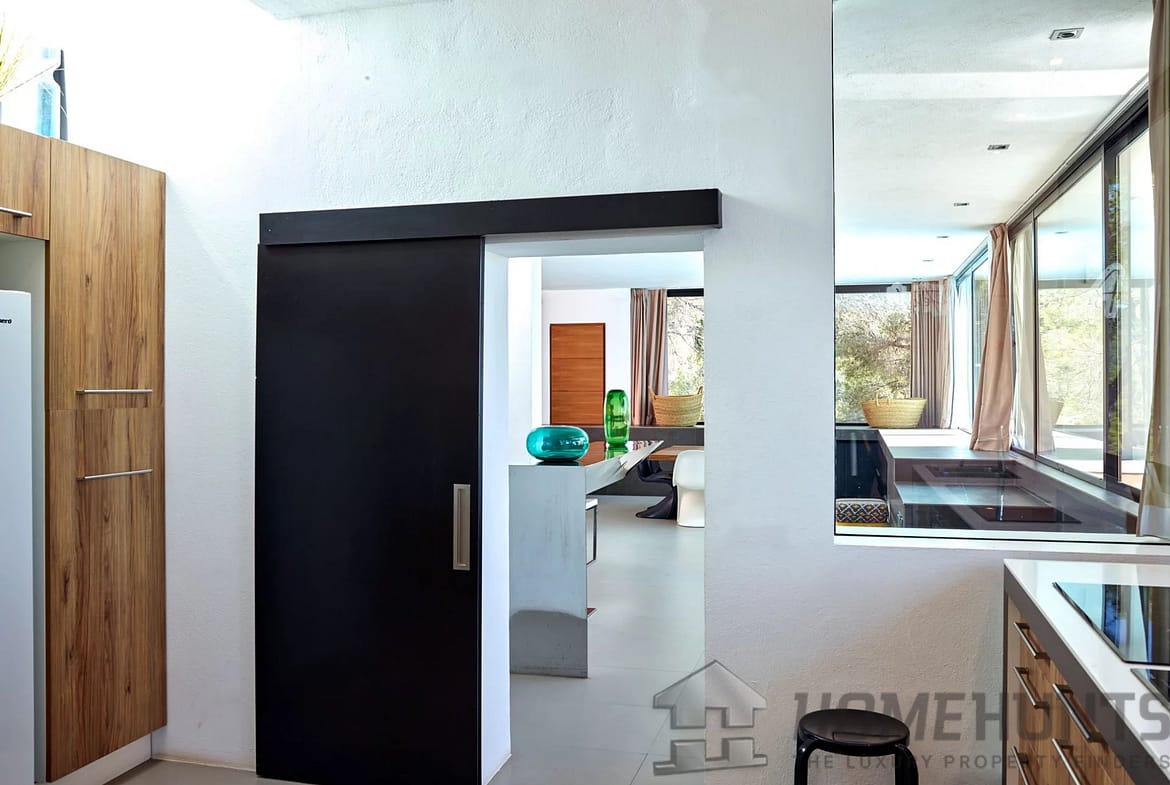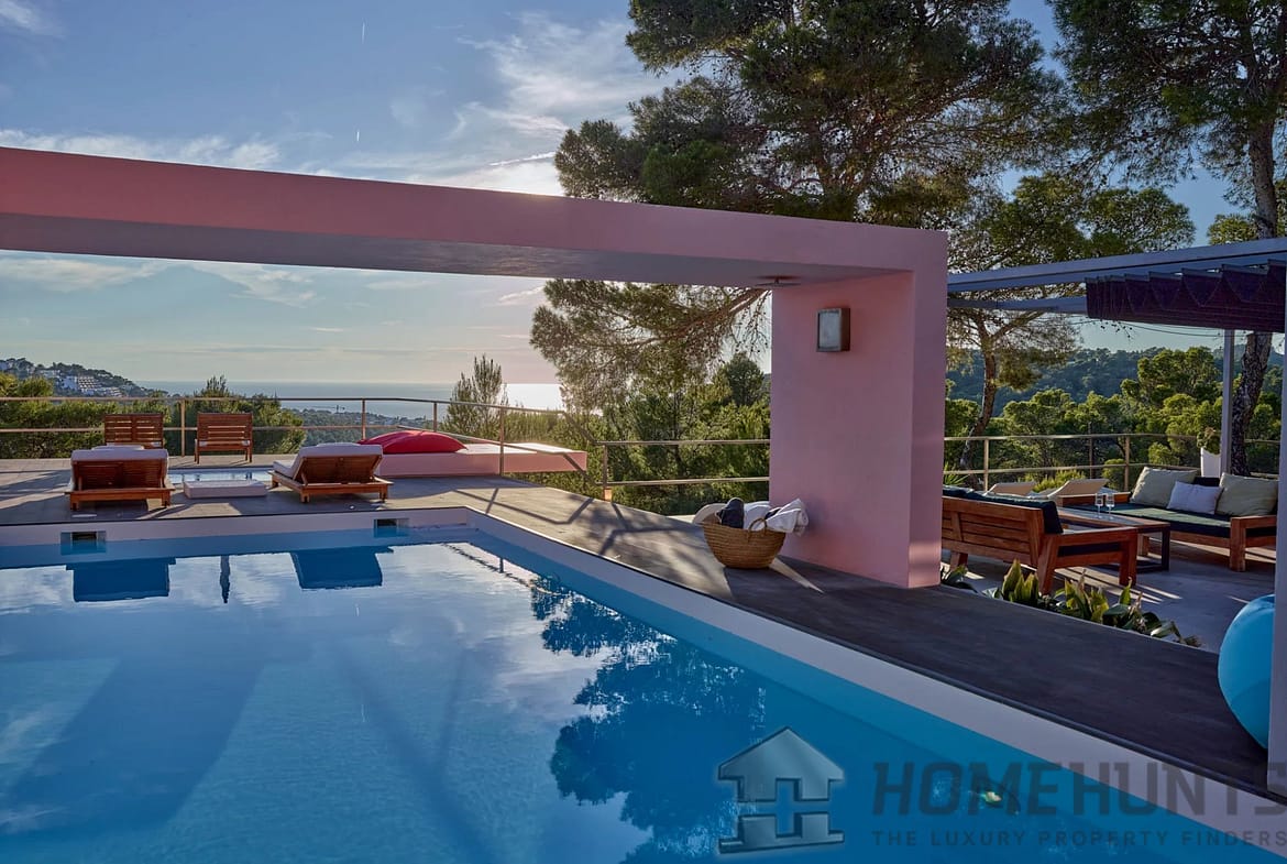 This impressive modern villa is located in the eastern part of Ibiza, near the famous Cala D’Hort and Cala Vadella beaches, surrounded by Mediterranean nature and pine trees. Situated on a quiet and private hillside, this hidden gem offers spectacular views of the sea and sunsets, ideal for enjoying unforgettable moments on the island. Just a few minutes from the charming village of San José, the property combines elegance, tranquility, and an unparalleled natural setting.