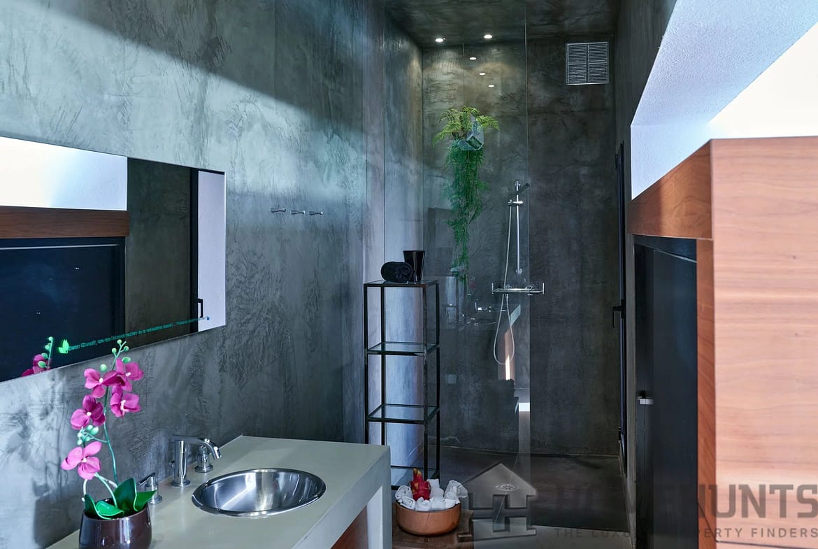 The villa offers several bedrooms with en-suite bathrooms, all with access to the outdoors through large sliding doors. The master bedroom, with an en-suite bathroom that includes a separate shower with side jets, is connected to the main living area but also offers privacy through sliding doors. Other bedrooms have direct access to the garden or a wooden terrace under the pool, creating a unique and relaxing atmosphere.