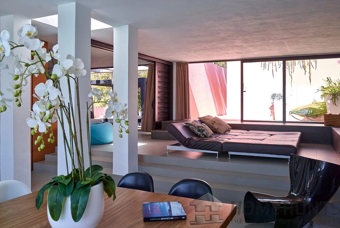 The villa is designed with a minimalist Japanese style, seamlessly integrating indoor and outdoor spaces. The large glass windows create a continuous connection between the house and its surroundings, while the pool and terraces offer an unmatched luxury experience. The spacious terrace is equipped with sofas and a dining table for 10, creating the perfect atmosphere for outdoor entertainment and relaxation.