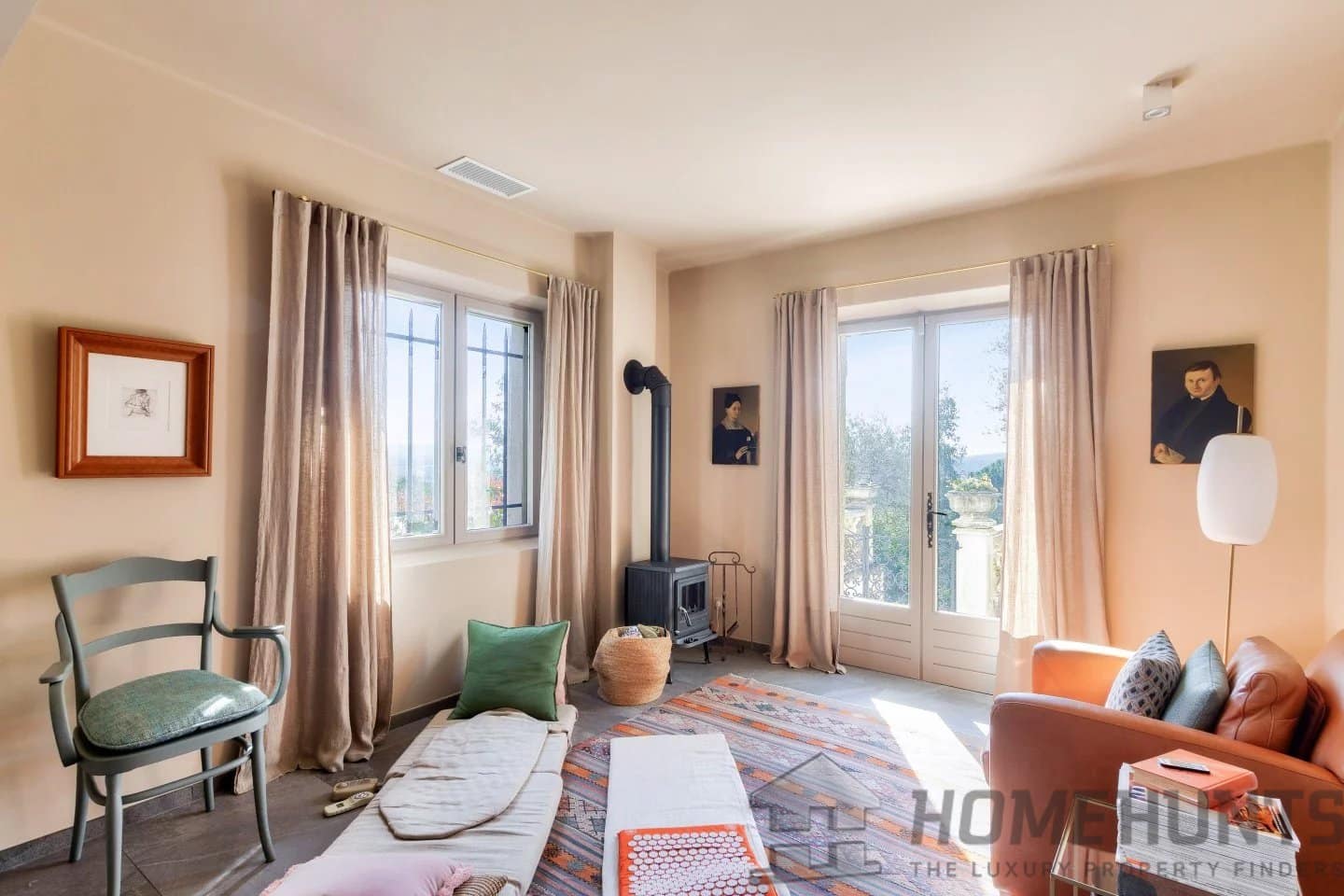 Nestled on a sunny hillside, this property offers breathtaking panoramic views of the surrounding countryside. The house, covering an area of 290 m2, includes a 54 m2 guest apartment and sits on a 4200 m2 plot adorned with a variety of trees, such as fruit trees, century-old olive trees, oleanders, and lavender.