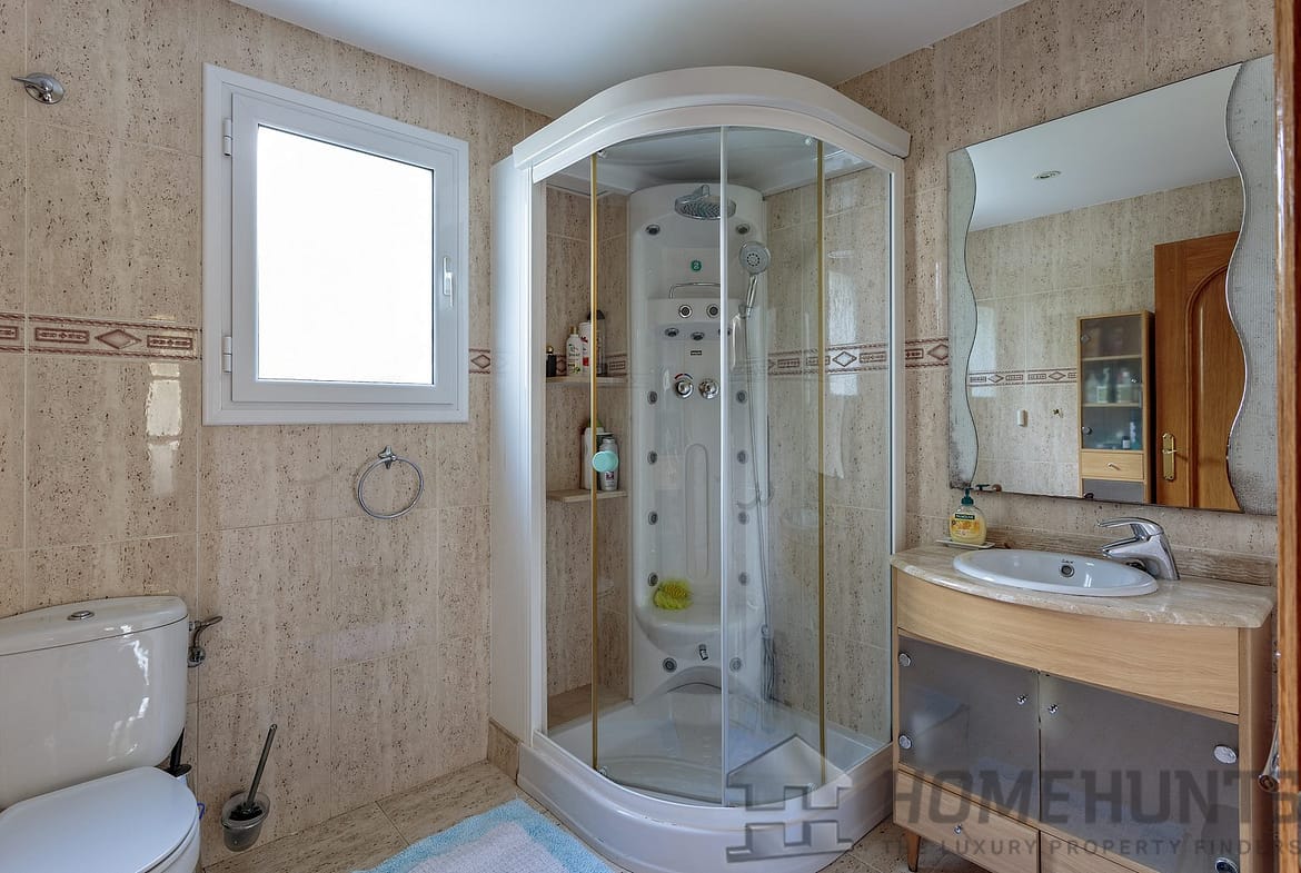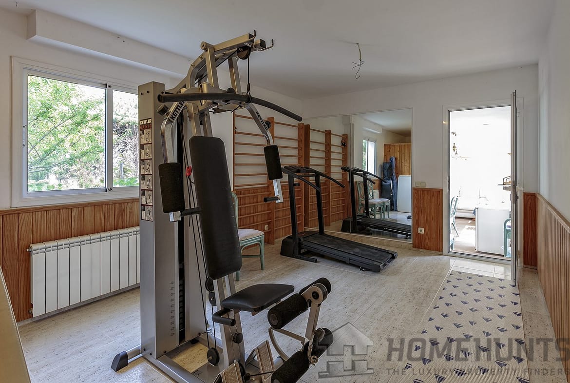 Machine room, laundry, garage for 2 cars with storage racks, sauna, gym, bedroom with living room-library with access to the garden and to the pool, bathroom with shower, summer kitchen-lounge with barbecue and bathroom with shower, with access to the pool and garden, as well as to a barbecue and a dining table made of natural stone. Air conditioning in the library.