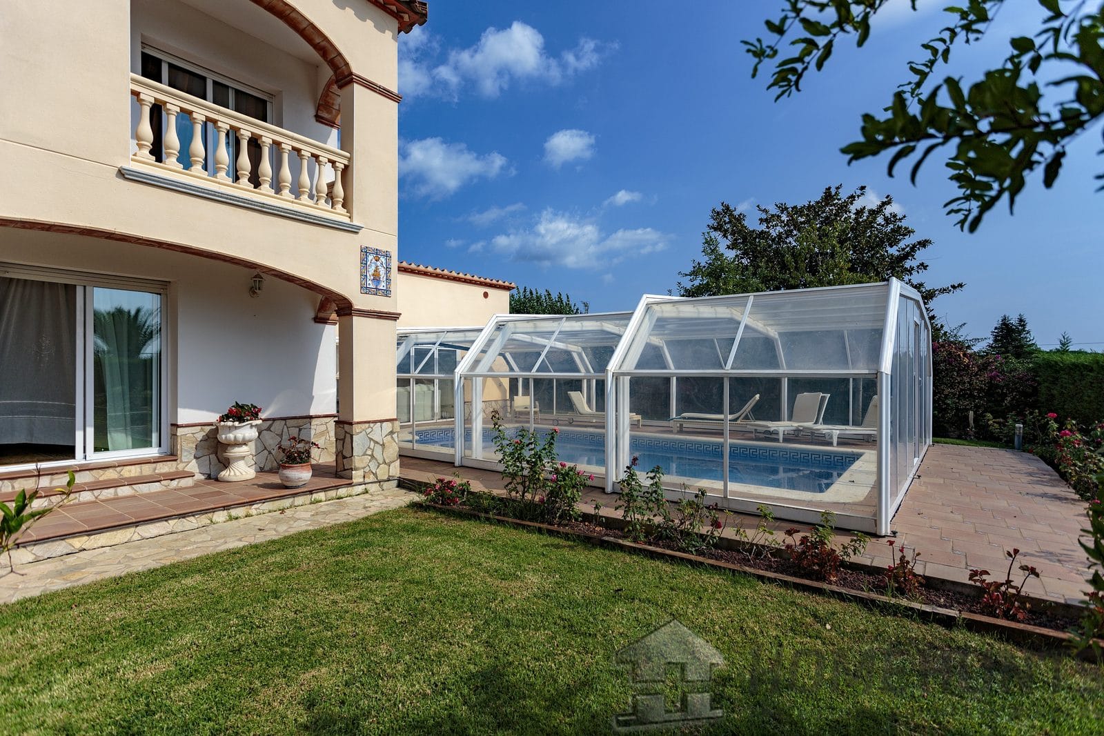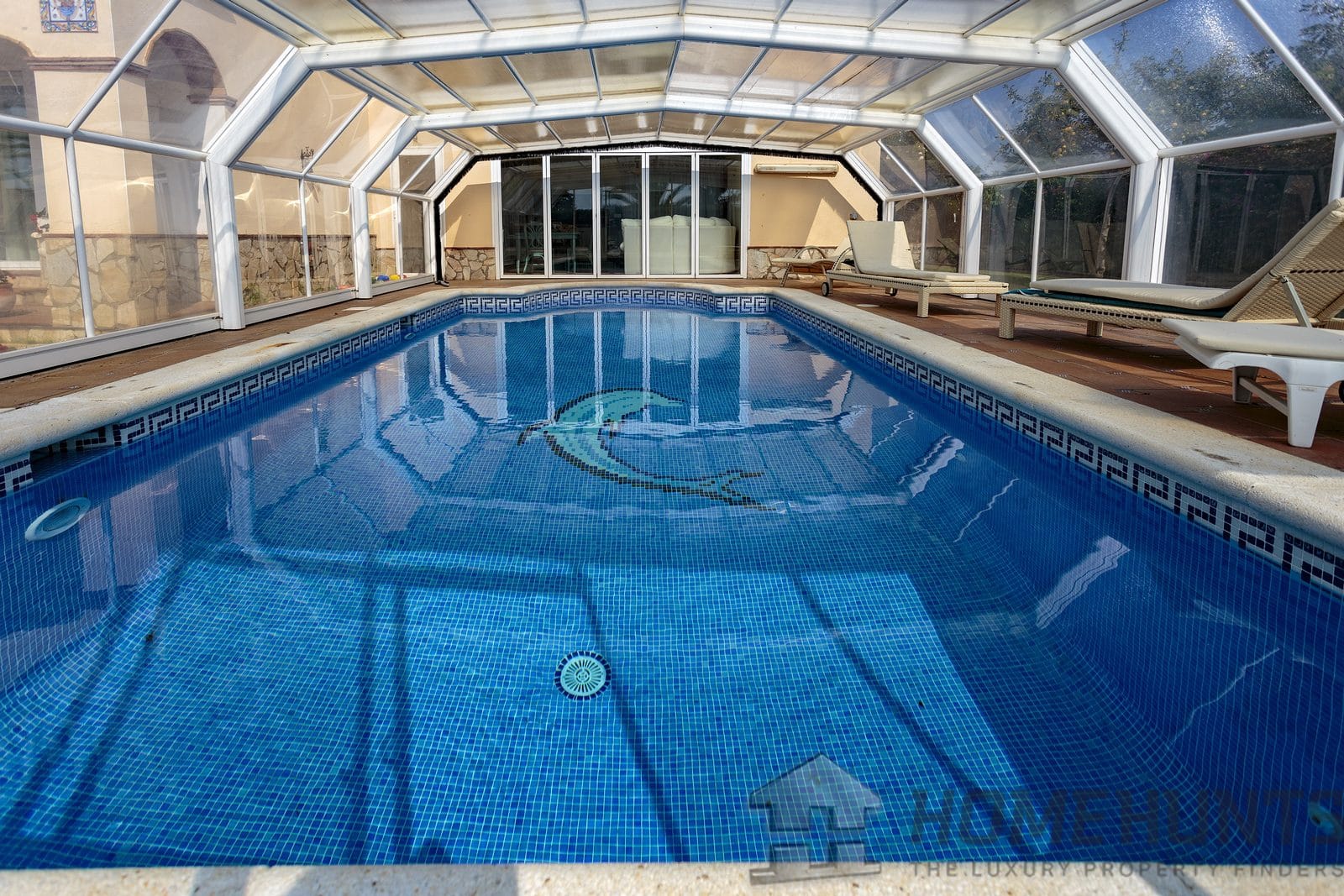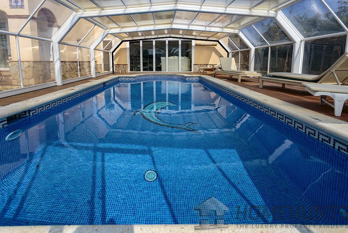 Heated swimming pool with a glass roof consisting of 4 sections, 2 of which open.