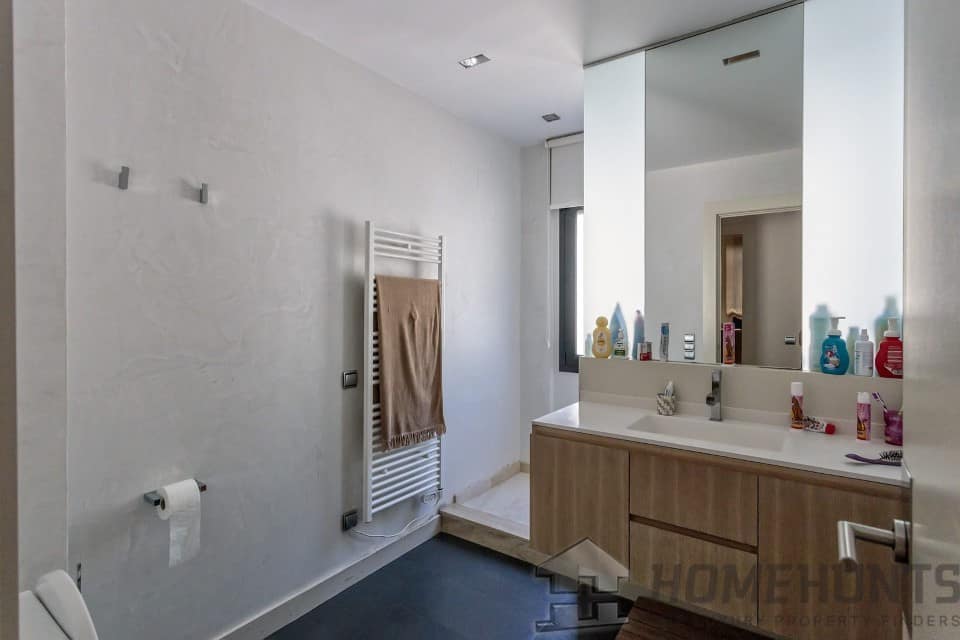 Spacious lounge opening onto a terrace and to the pool. Fully equipped open plan kitchen with a central island. 3 bedrooms (one of them is a suite with a bathroom with a bath and a dressing room, with access to the terrace). Office. Bathroom with shower, toilet.