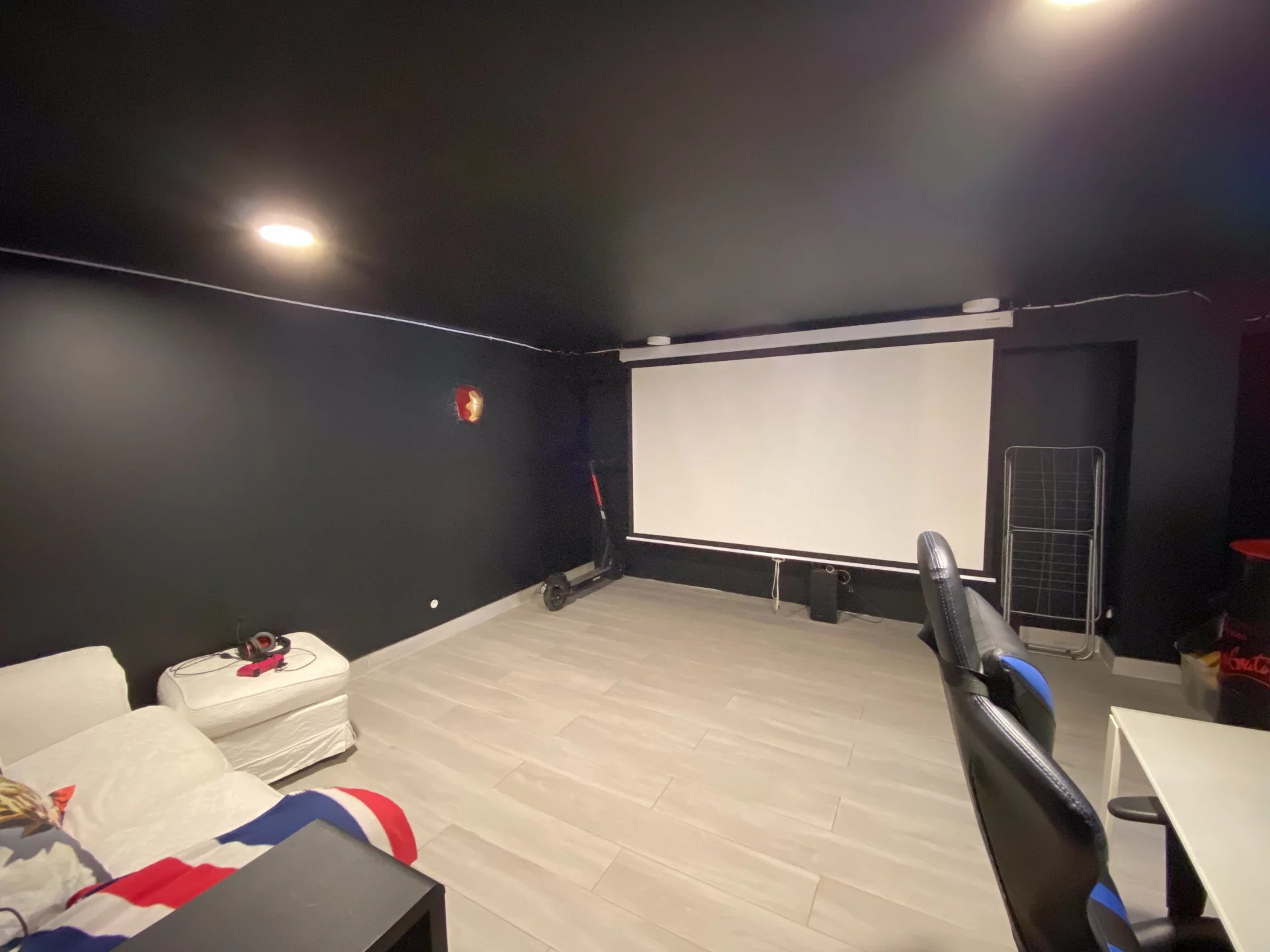 On the garden level: an entrance, a living room with an open fitted kitchen, a bedroom, a bathroom, a toilet, a cinema room, and a laundry room.